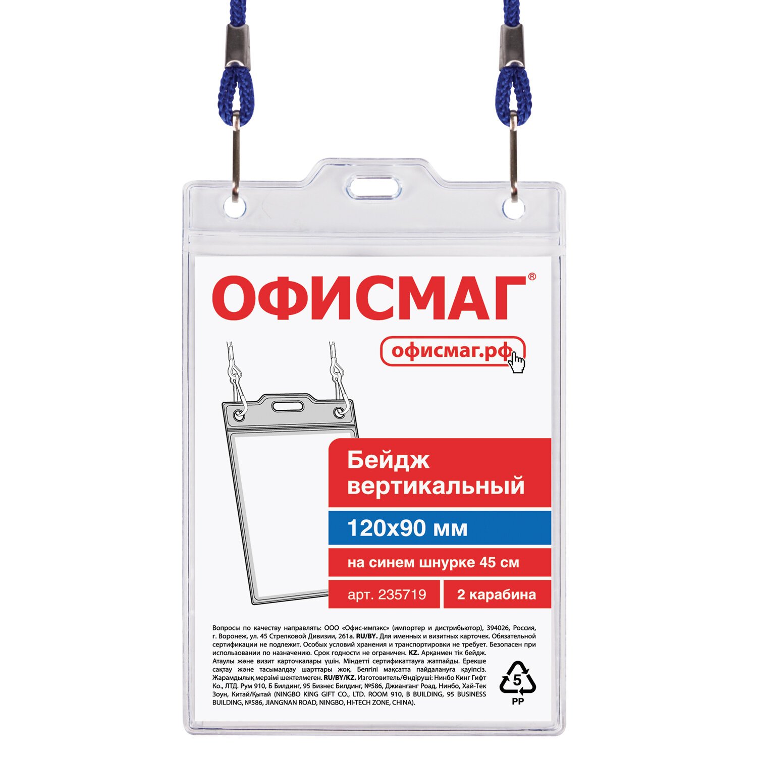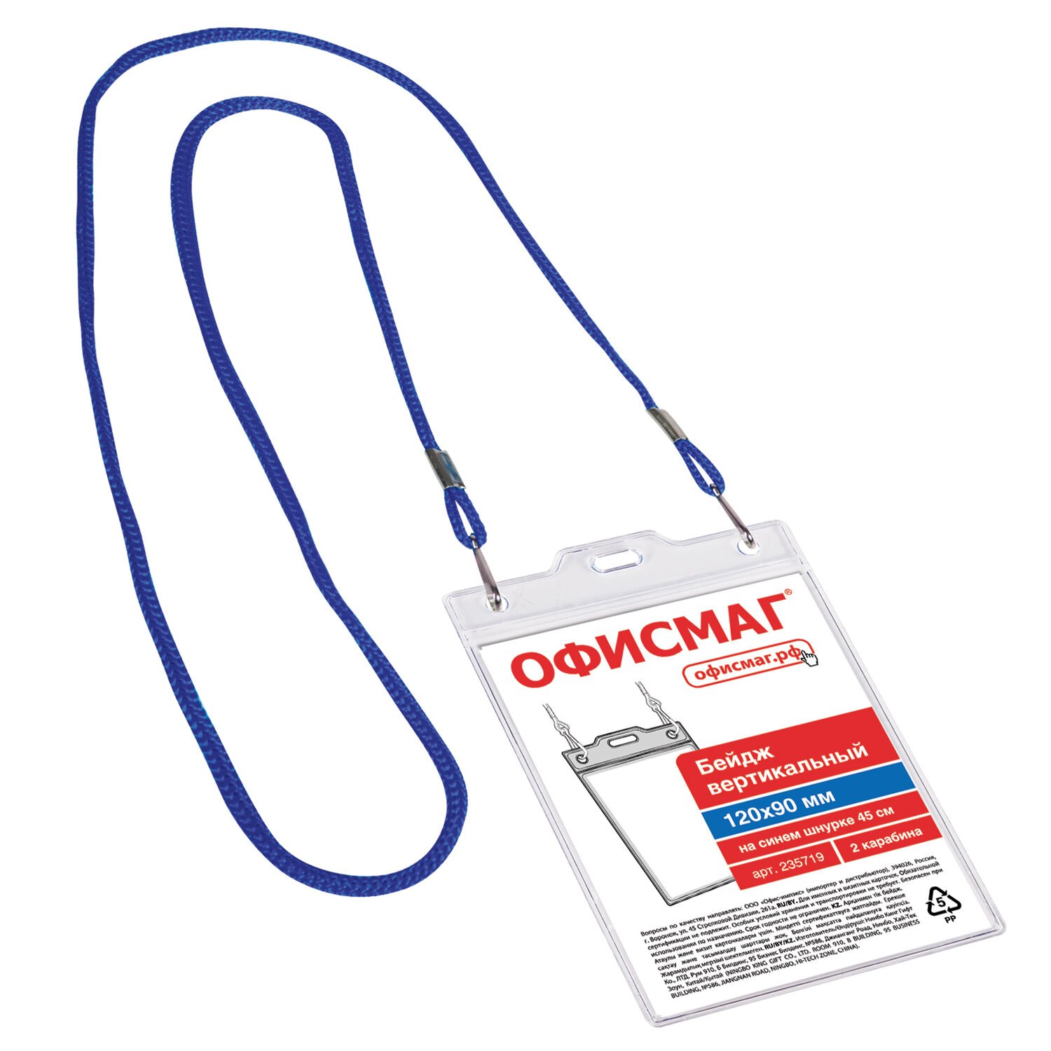 Бейдж вертикальный БОЛЬШОЙ (120х90 мм), на синем шнурке 45 см, 2 карабина, ОФИСМАГ, 235719