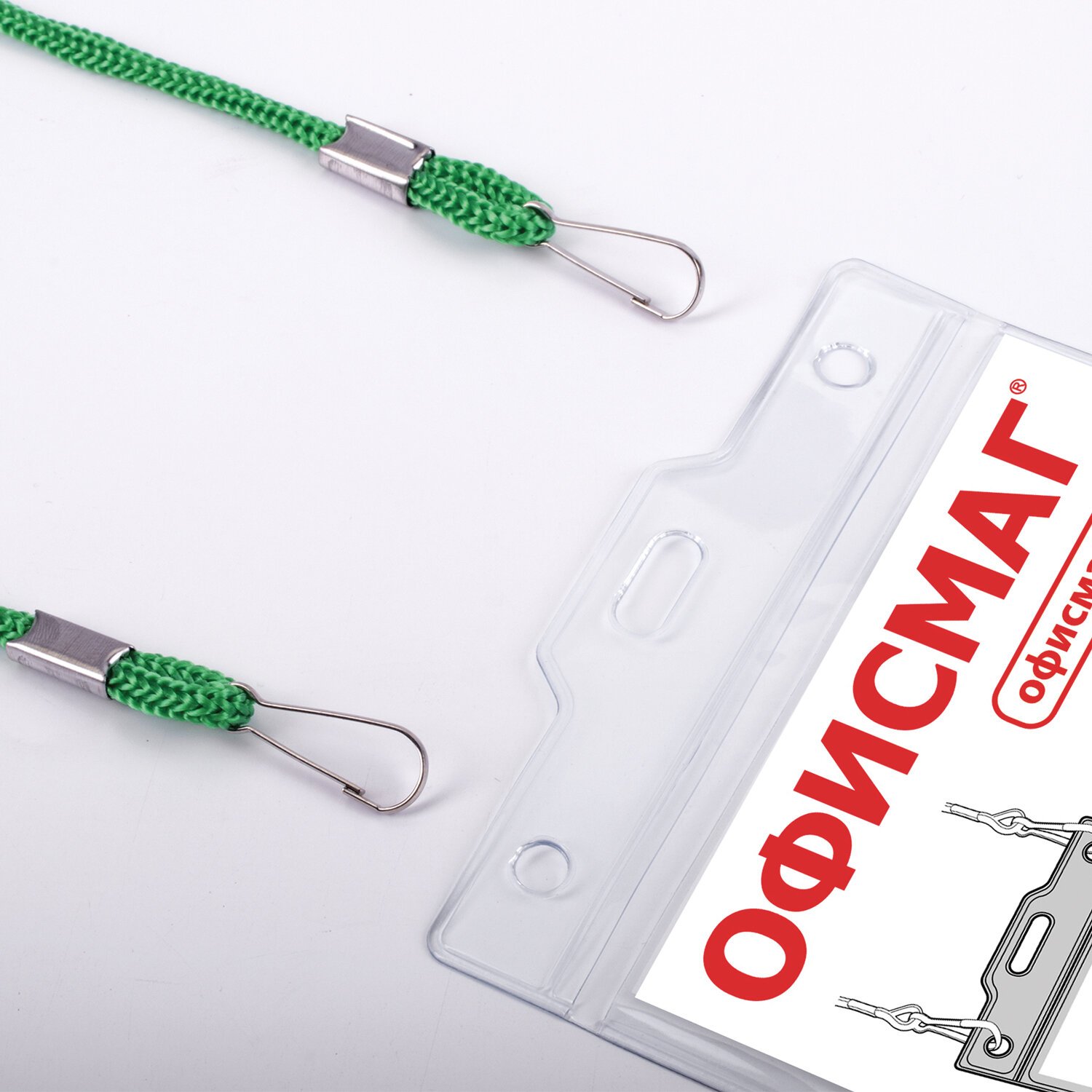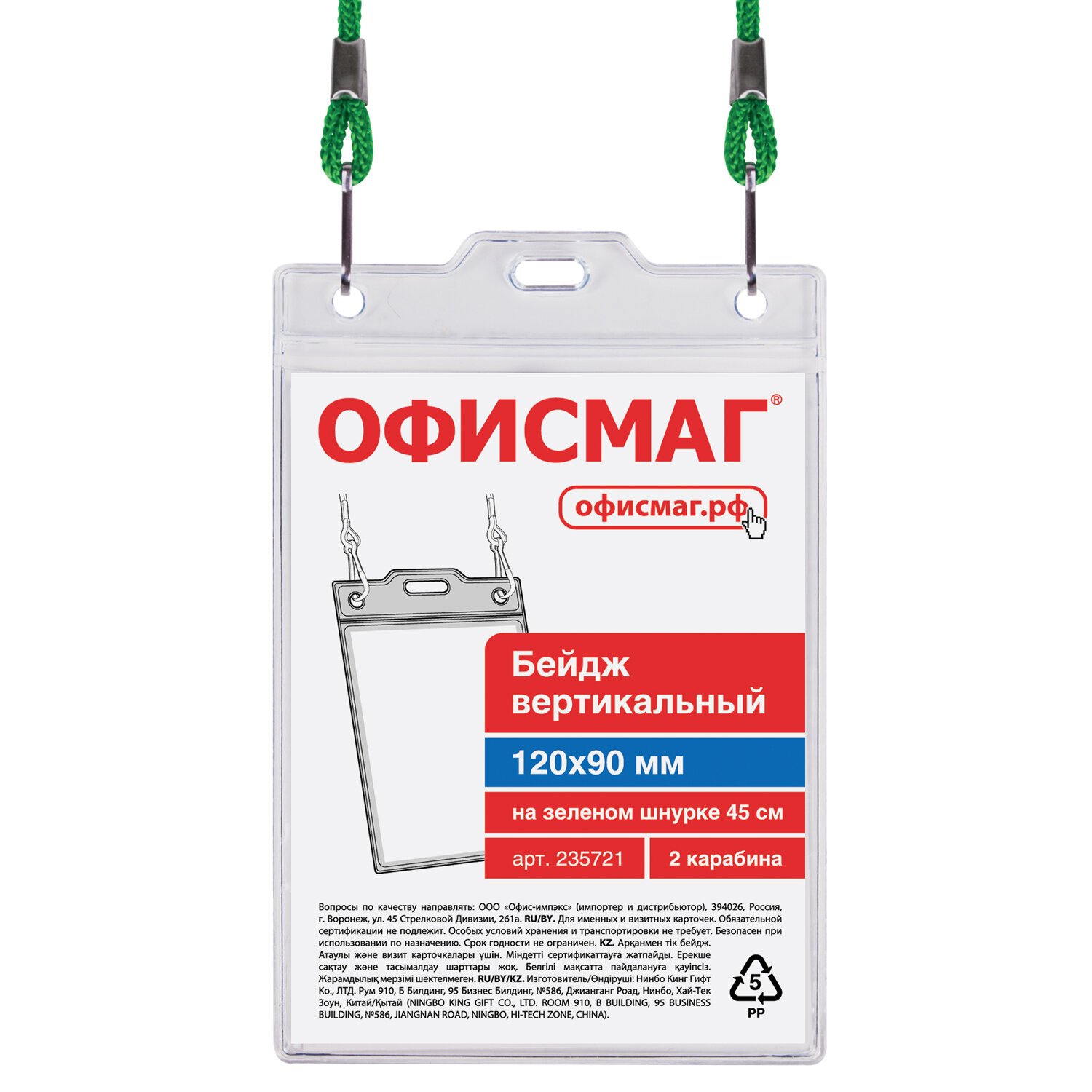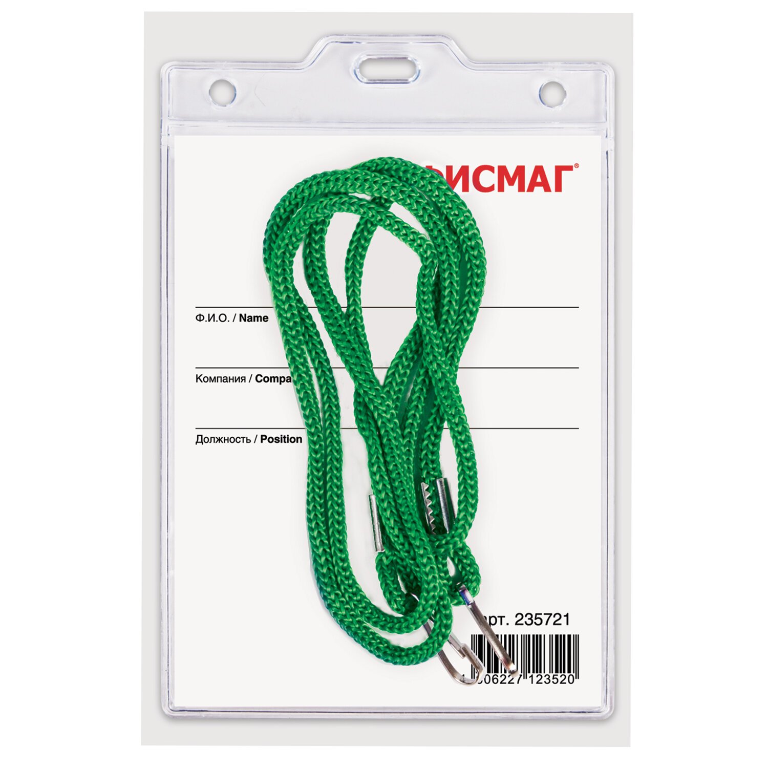 Бейдж вертикальный БОЛЬШОЙ (120х90 мм), на зеленом шнурке 45 см, 2 карабина, ОФИСМАГ, 235721