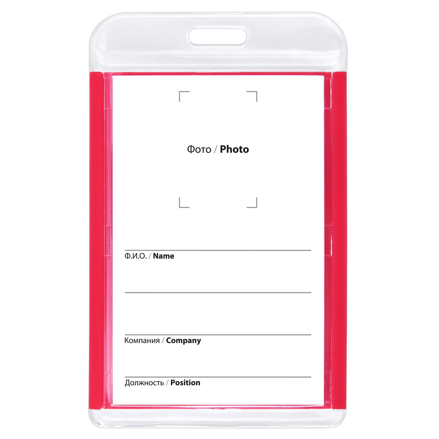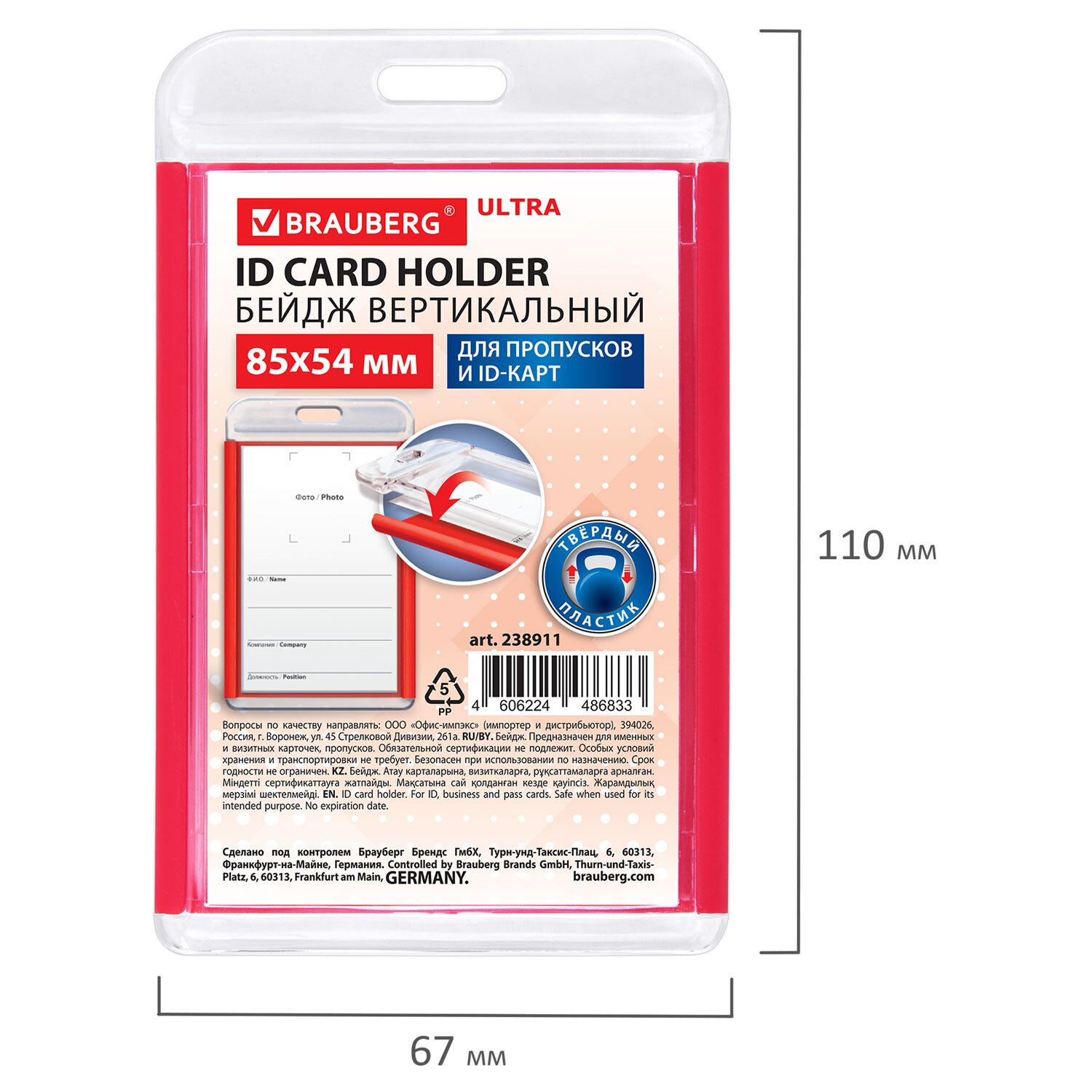 Бейдж вертикальный для пропуска и ID-карт 85х54 мм красный, BRAUBERG ULTRA, 238911