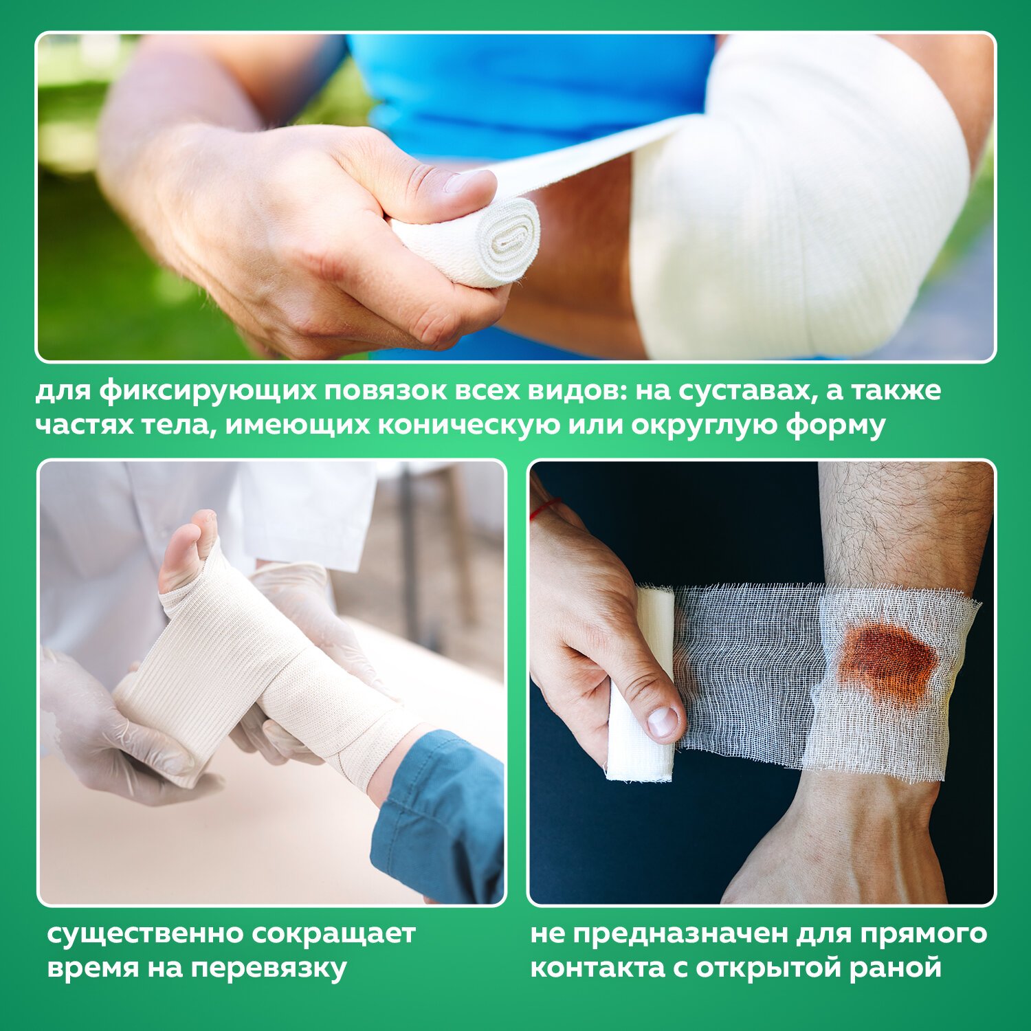 Бинт предназначен для фиксирующих повязок всех видов - на суставах, а также частях тела, имеющих коническую или округлую форму, существенно сокращает время, необходимое для перевязки, не предназначен для прямого контакта с открытой раной.