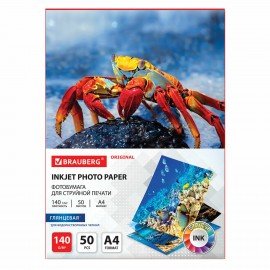 Фотобумага глянцевая, А4, 140 г/м2, односторонняя, 50 листов, BRAUBERG ORIGINAL, 363982