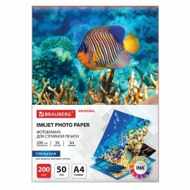 Фотобумага глянцевая, А4, 200 г/м2, односторонняя, 50 листов, BRAUBERG ORIGINAL, 363988