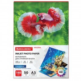 Фотобумага глянцевая БОЛЬШОГО ФОРМАТА, А3, 160 г/м2, односторонняя, 50 листов, BRAUBERG ORGINAL, 363994