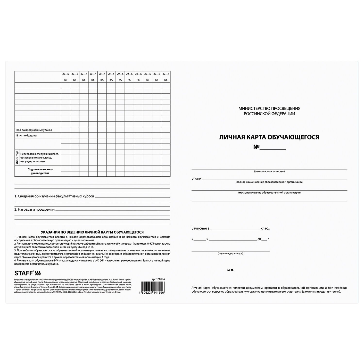 Бланк бухгалтерский офсет плотный, "Личная карточка обучающегося", А4 (200х275 мм), 2 л., STAFF, 130194