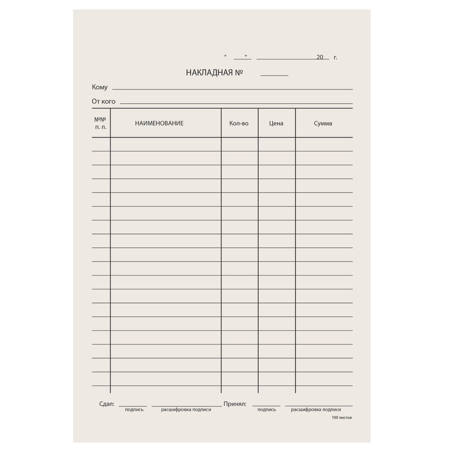 Бланк бухгалтерский типографский "Накладная", А5 (134х192 мм), СКЛЕЙКА 100 шт., 130011