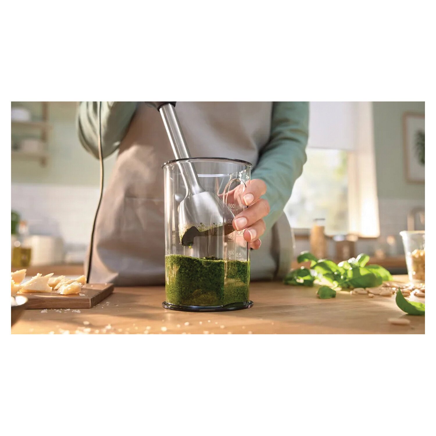 Блендер оснащён ножом QuattroBlade с 4 лезвиями, обеспечивающим равномерное измельчение даже самых плотных ингредиентов. Также в комплекте предусмотрен мерный стакан, что делает его универсальным помощником для супов, соусов, пюре и многого другого. Погружная часть выполнена из прочного металла, а корпус — из долговечного пластика, устойчивого к загрязнениям и повреждениям.