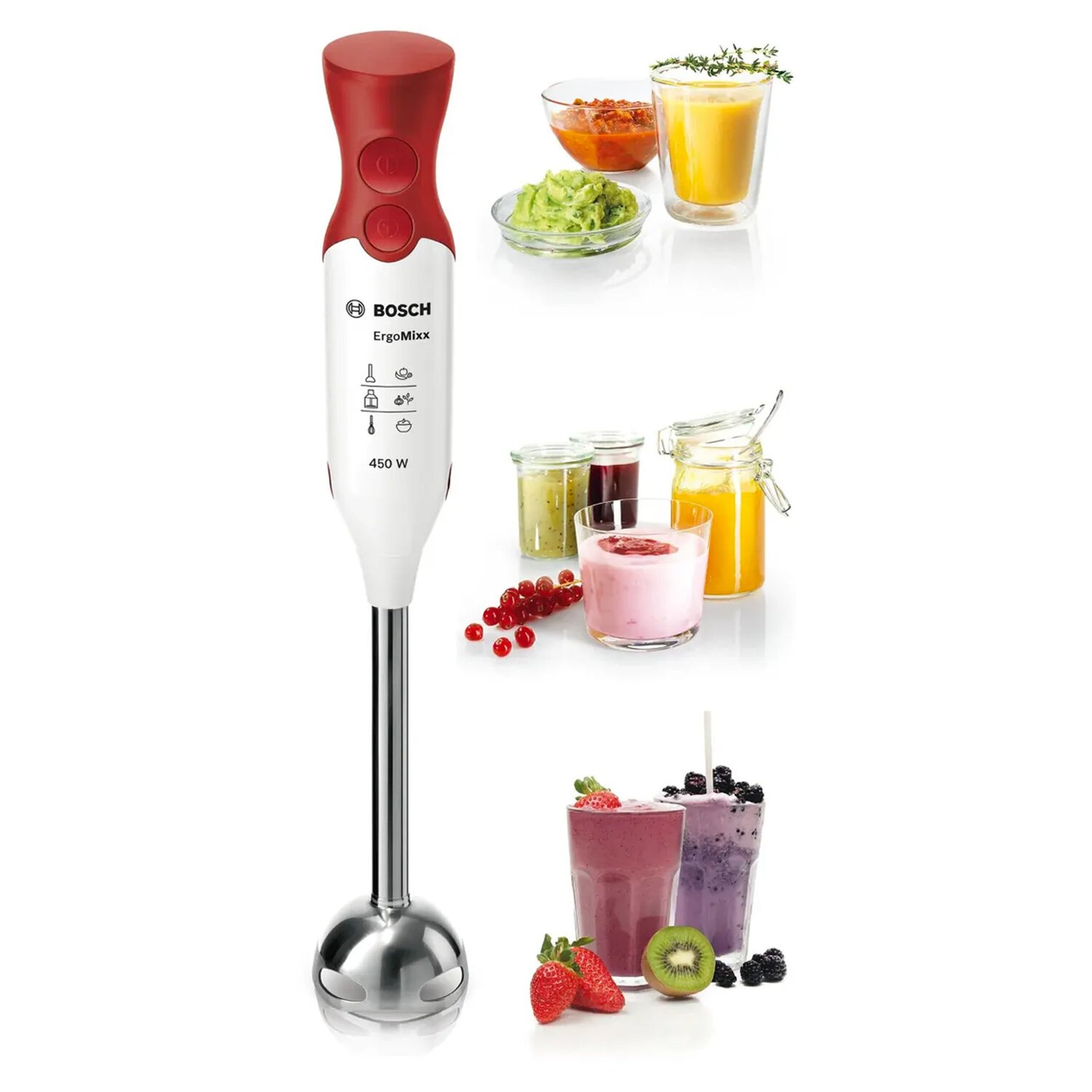 Блендер погружной BOSCH MSM64110, 450 Вт, 2 скорости, 1 насадка, стакан, белый/красный