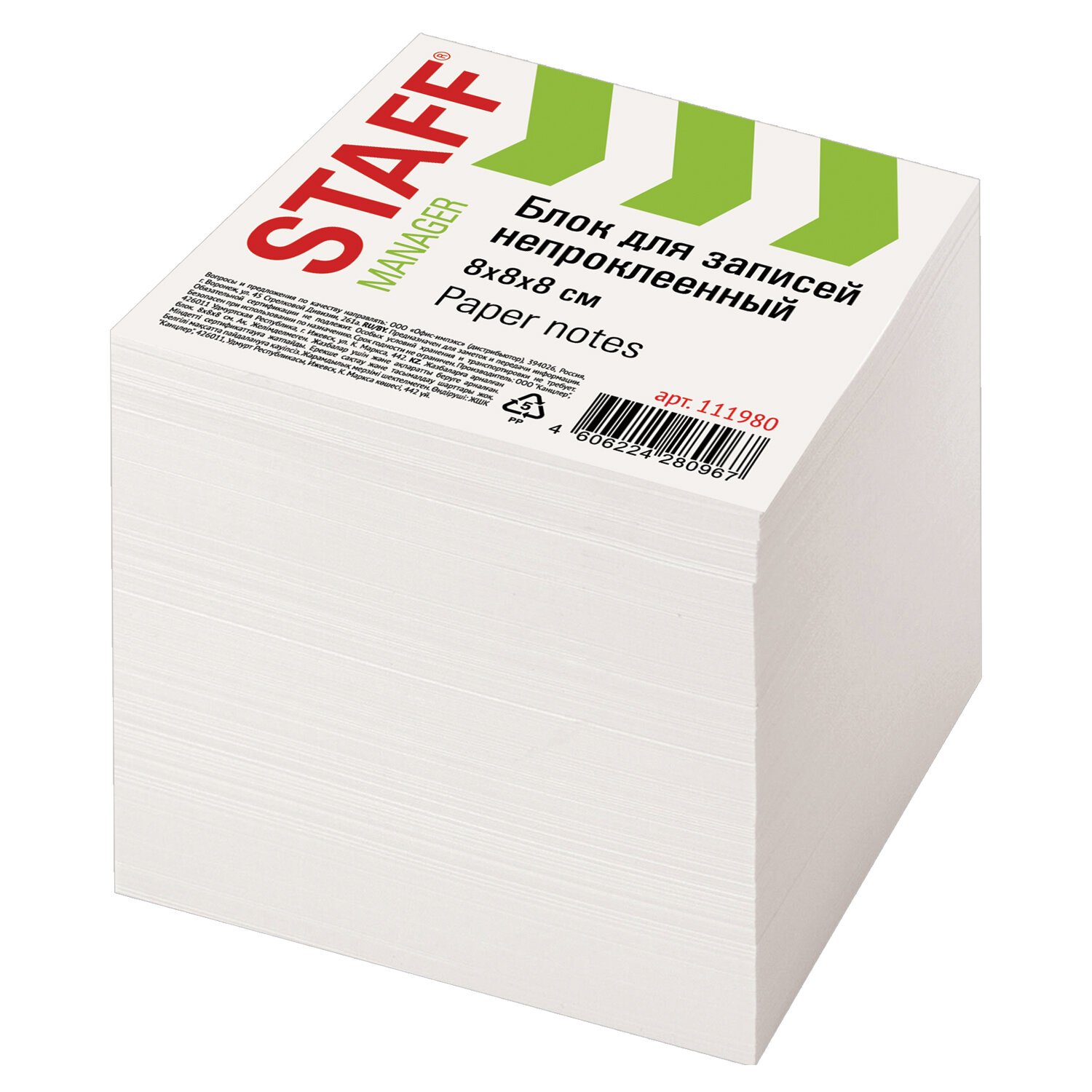 Блок для записей STAFF непроклеенный, куб 8х8х8 см, белый, белизна 90-92%, 111980