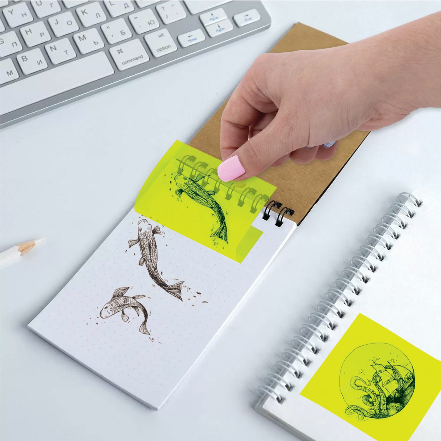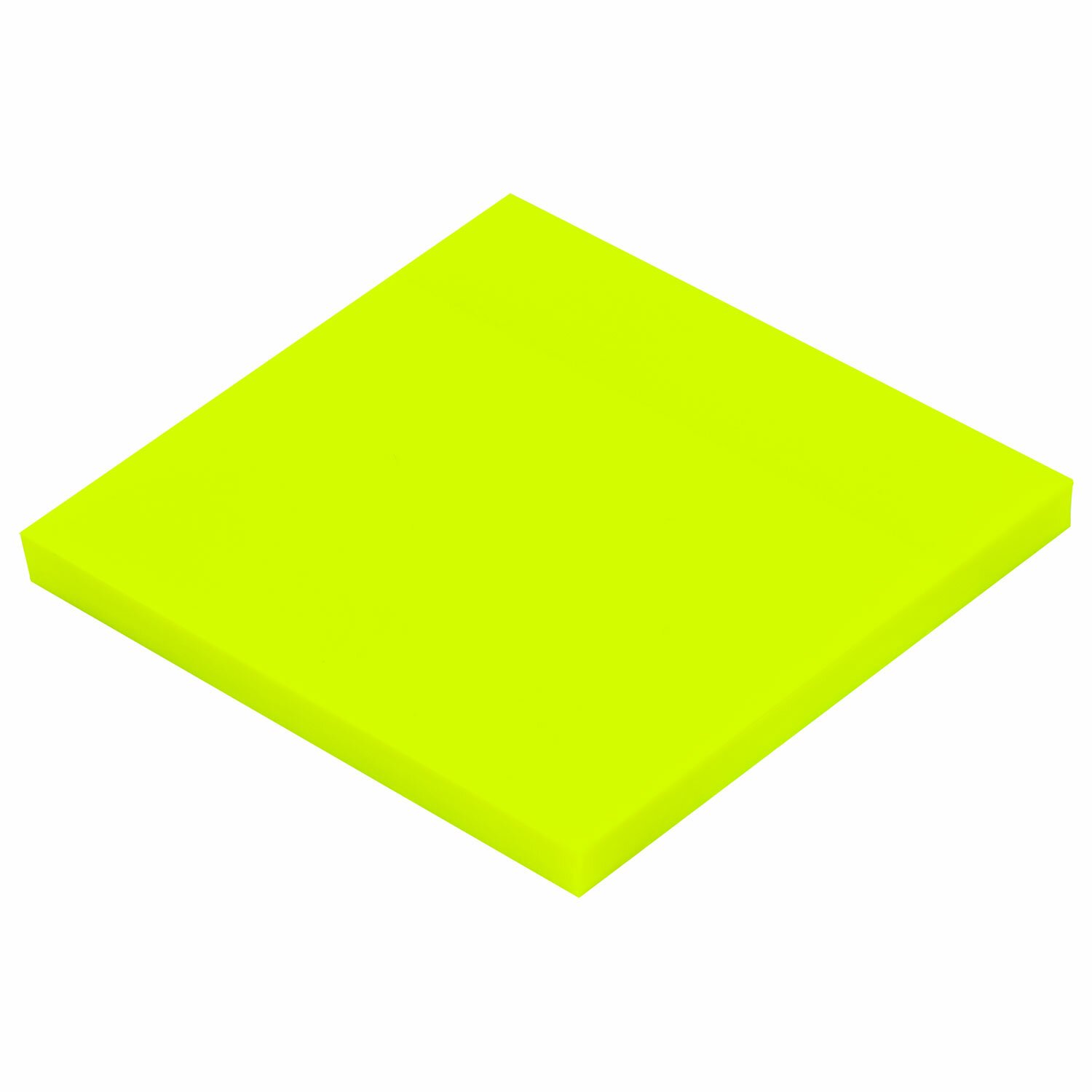 Блок пластиковых полупрозрачных стикеров желтого цвета в форме квадрата размером 76х76 мм состоит из 100 листов. Стикеры легко клеятся к любой поверхности. Возможно многоразовое использование. Не оставляют следов, водостойкие. Сохраняют свои клейкие качества в независимости от способа отделения от блока.