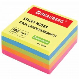 Блок самоклеящийся (стикеры), BRAUBERG, НЕОНОВЫЙ, 76х76 мм, 400 листов, 5 цветов, 122855