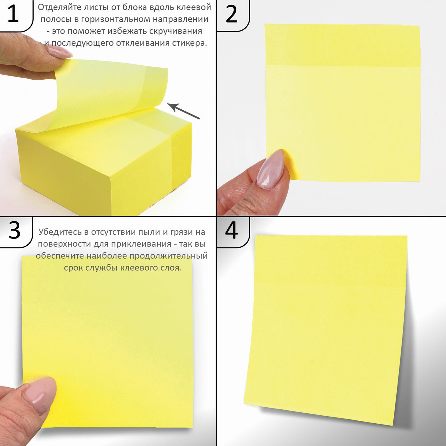 - отделяйте листы от блока вдоль клеевой полосы в горизонтальном направлении - это поможет избежать скручивания и последующего отклеивания стикера;
