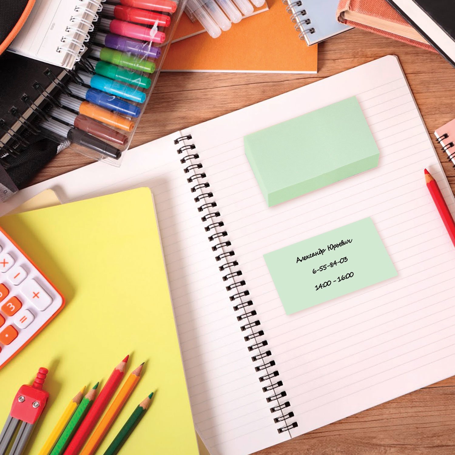 Стикеры зелёного пастельного цвета в форме прямоугольника 76х51 мм состоят из 100 листов. Плотность бумаги составляет 75 г/м2. Клейкий слой - 35 Н/м. Легко клеятся к любой поверхности. Не оставляют следов. Упакованы в полиэтиленовую пленку.