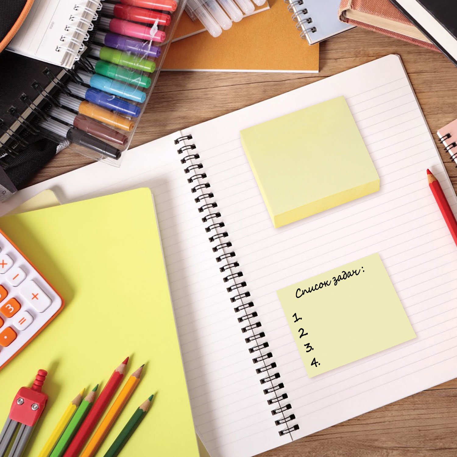 Стикеры классического жёлтого цвета в форме квадрата 76х76 мм состоят из 100 листов. Плотность бумаги составляет 75 г/м2. Клейкий слой - 35 Н/м. Легко клеятся к любой поверхности. Не оставляют следов. Упакованы в полиэтиленовую пленку.
