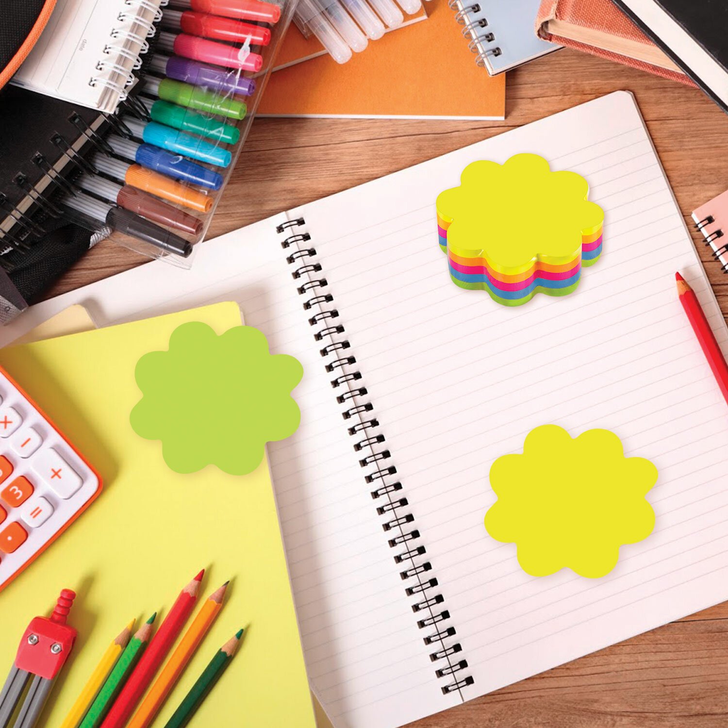 Стикеры 5 неоновых цветов (желтый, розовый, зеленый, оранжевый, малиновый) в форме цветка 67х67 мм состоят из 250 листов. Плотность бумаги составляет 75 г/м2. Клейкий слой - 35 Н/м. Легко клеятся к любой поверхности. Не оставляют следов. Упакованы в полиэтиленовую пленку.