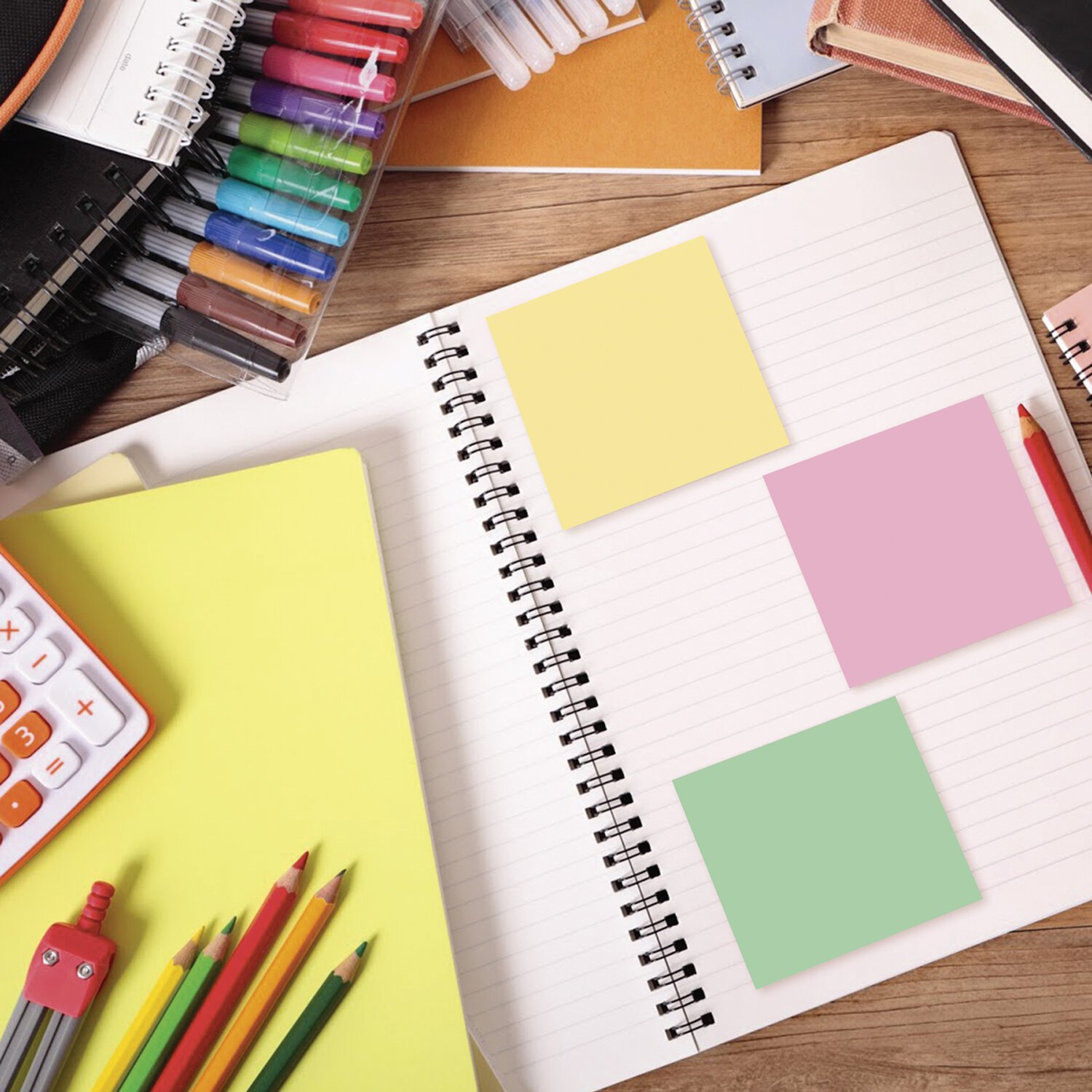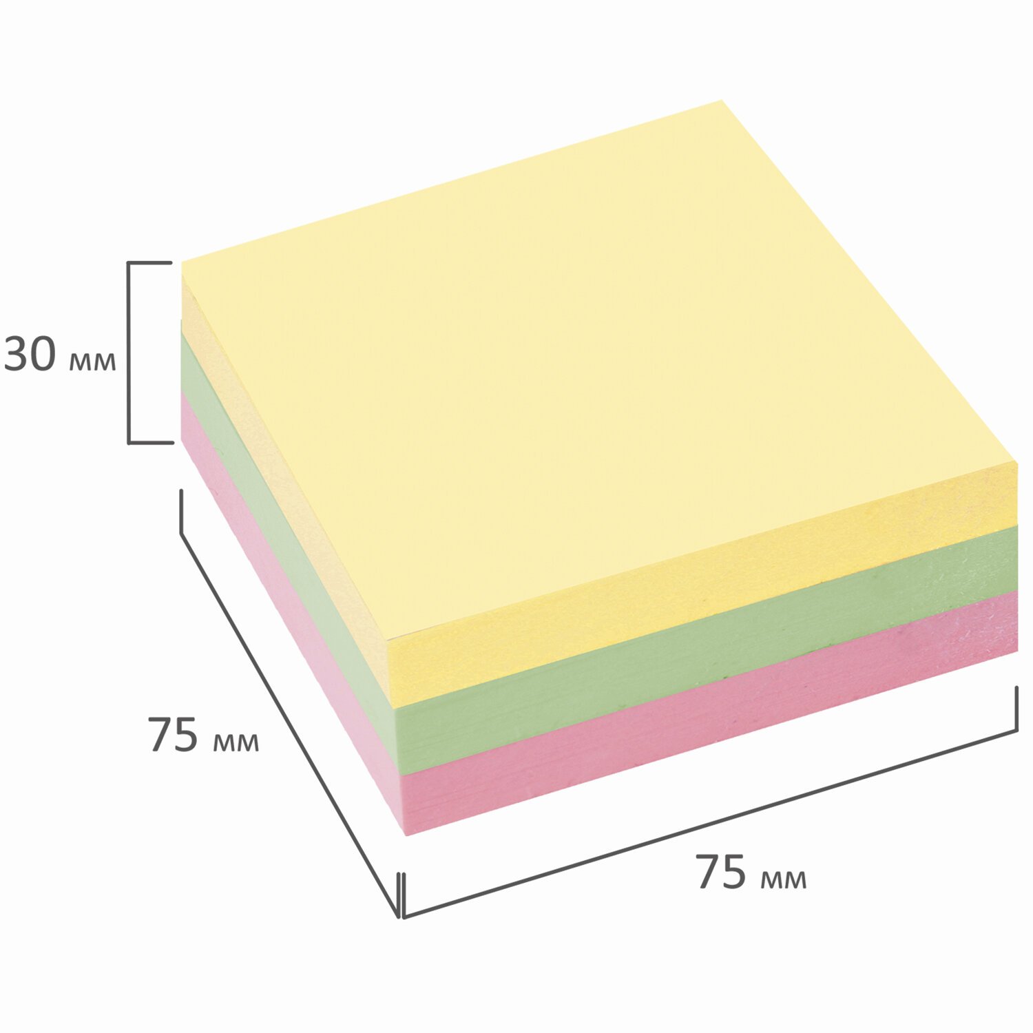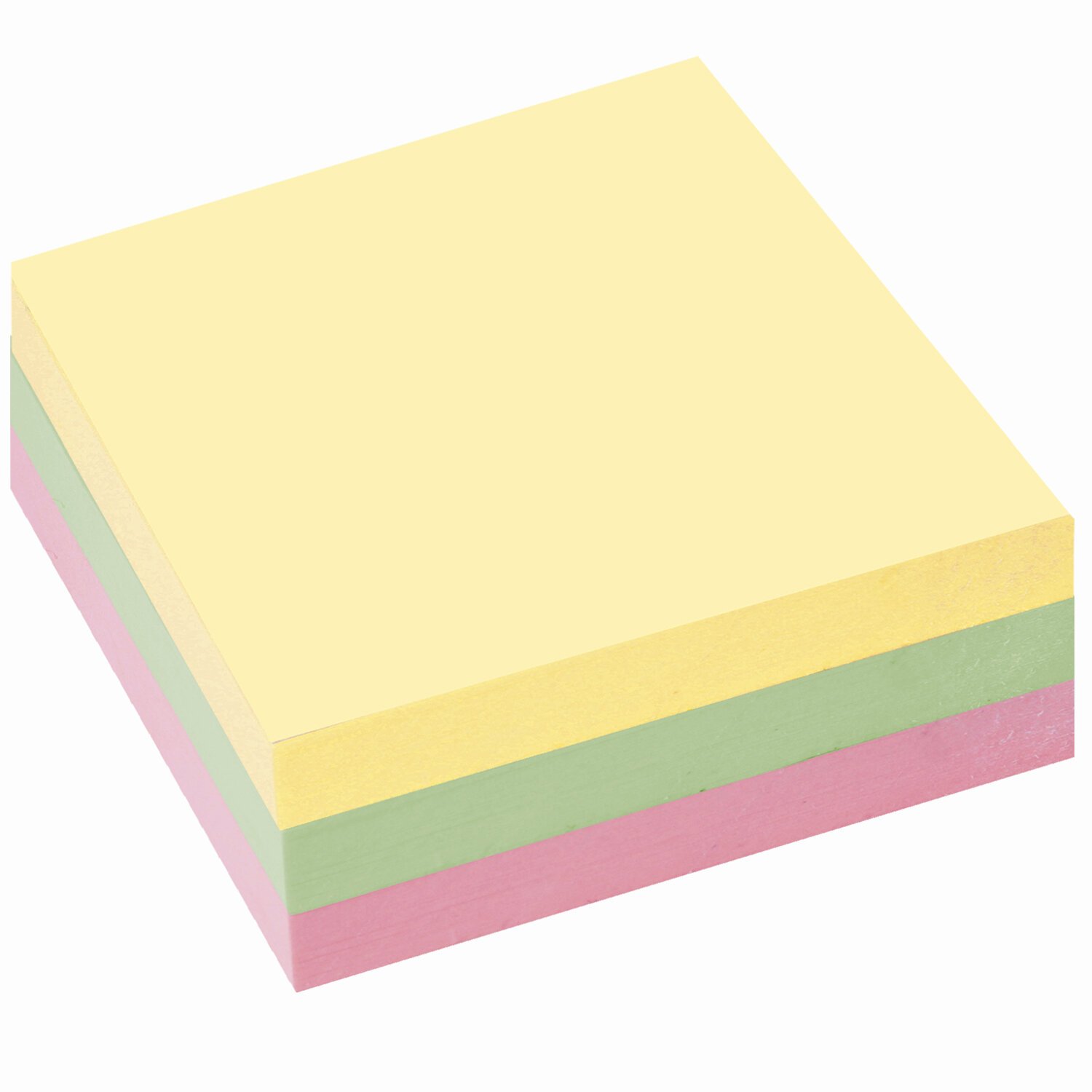 Стикеры 3 пастельных цветов (желтый, зеленый, розовый) в форме куба 75х75 мм состоят из 300 листов. Плотность бумаги составляет 75 г/м2. Клейкий слой - 22 Н/м. Легко клеятся к любой поверхности. Не оставляют следов. Упакованы в полиэтиленовую пленку.