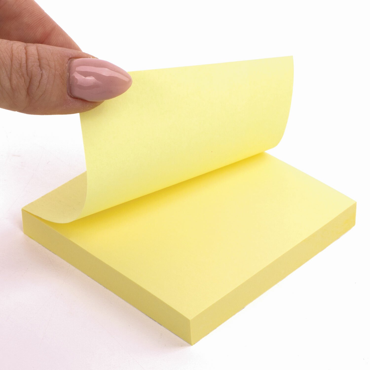 Самоклеящийся блок состоит из 100 листов желтого цвета. Размер: 76х76 мм. Плотность бумаги составляет 75 г/м2. Клейкий слой - 32 Н/м. Стикеры легко клеятся к любой поверхности, не оставляют следов. Упакованы в полиэтиленовую пленку.