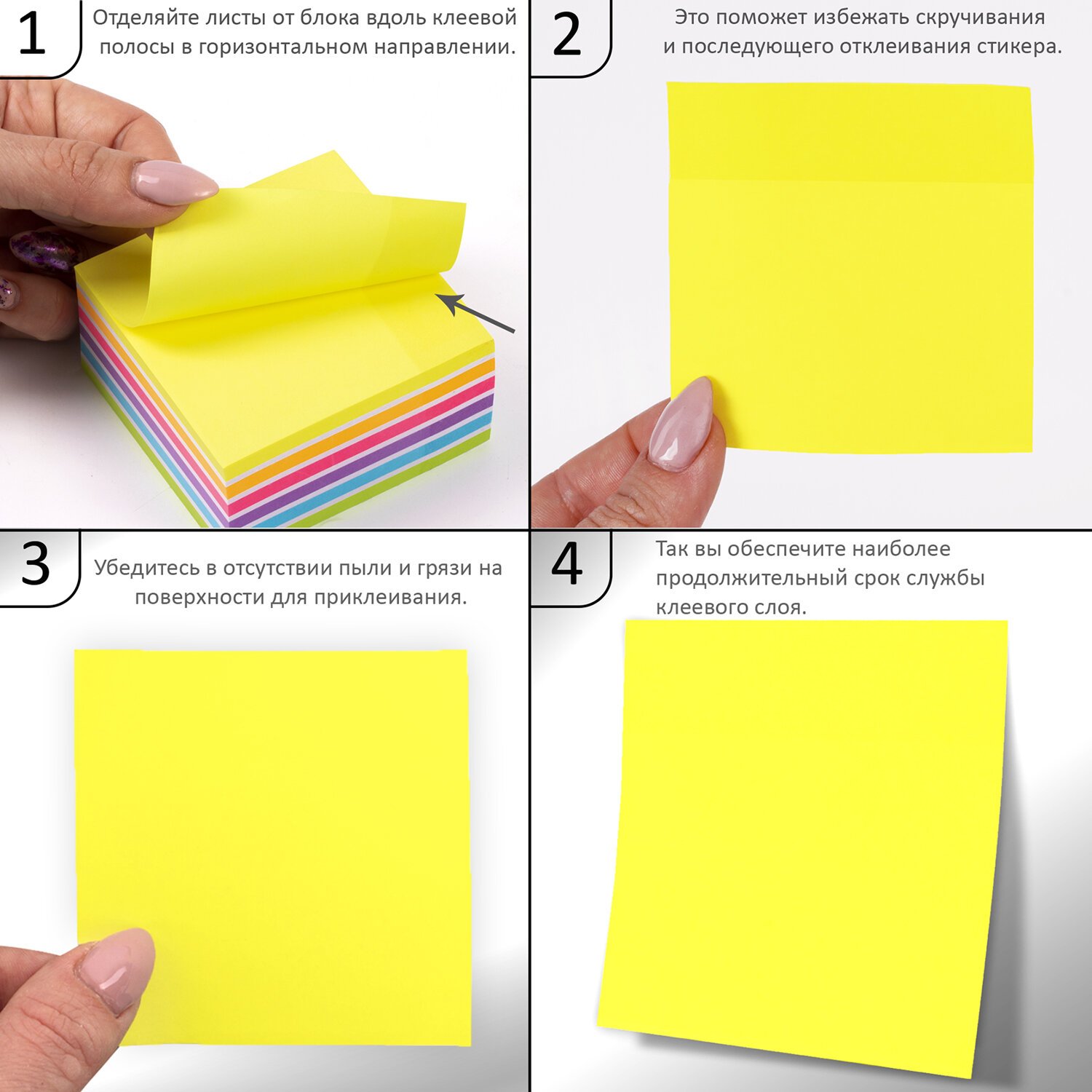 - отделяйте листы от блока вдоль клеевой полосы в горизонтальном направлении - это поможет избежать скручивания и последующего отклеивания стикера;