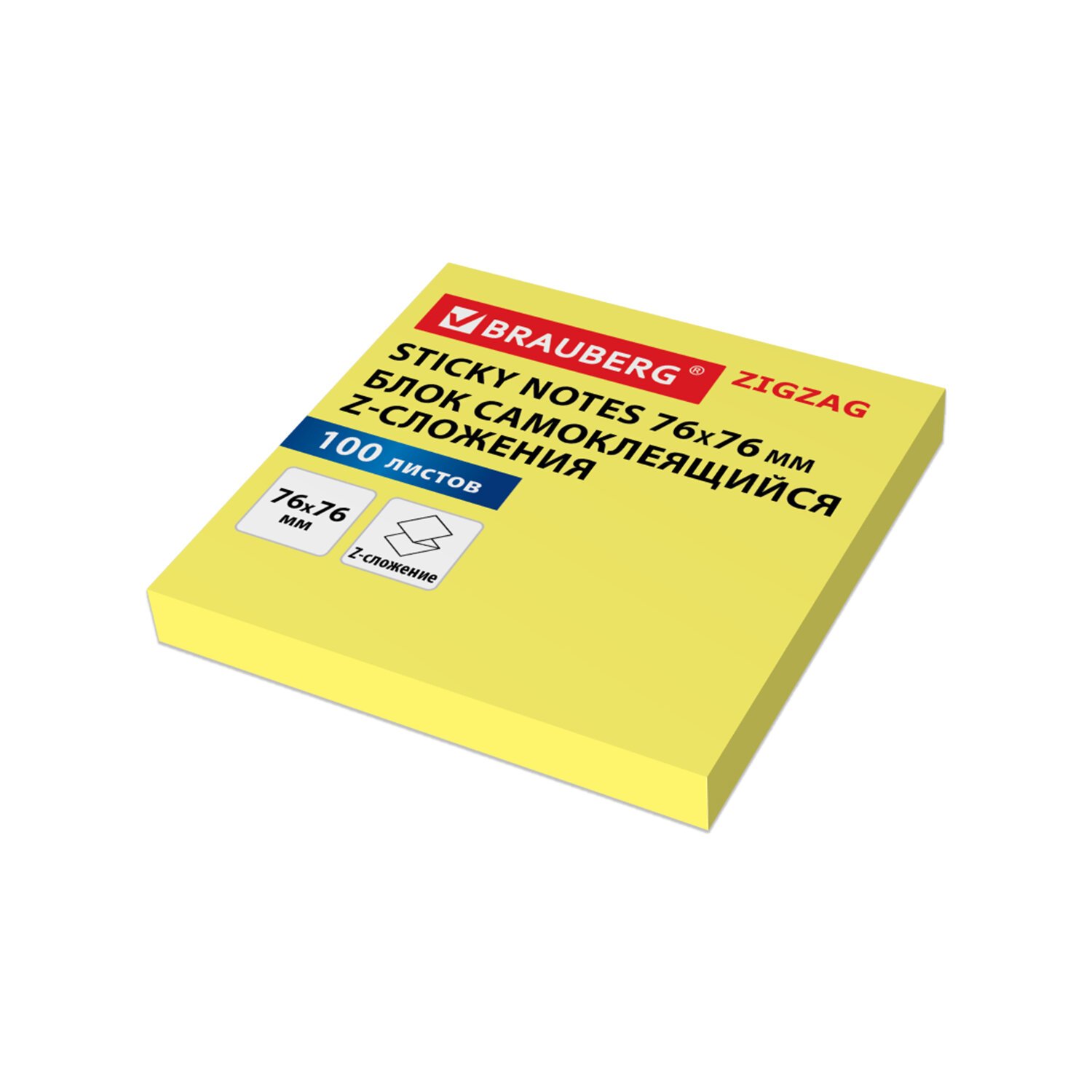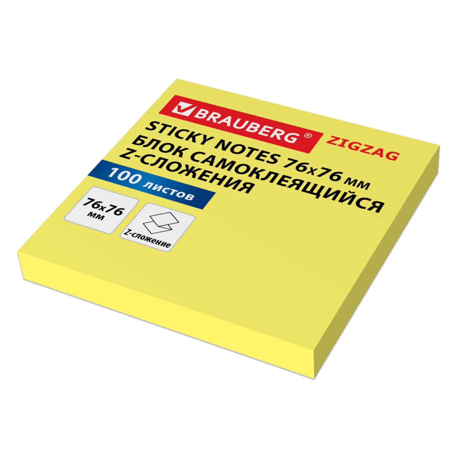 Блок самоклеящийся (стикеры) Z-сложения BRAUBERG ZigZag, 76х76мм, 100л, желтый, для диспенсера, 116681