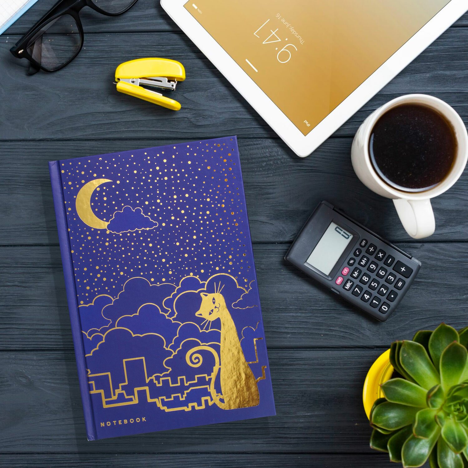 Жесткая обложка с матовой ламинацией и тиснением фольгой долго сохраняет привлекательный внешний вид и позволяет делать записи на весу. 80 листов позволят зафиксировать большой объем информации. Линовка блока в клетку дает возможность аккуратно заполнить цифровые значения, а также нанести чертежные зарисовки. Внутренний блок выполнен из офсета белого цвета плотностью 60 г/м2 и крепится к обложке с помощью книжного переплета. Формат блокнота А5 (134х206 мм) позволит владельцу поместить его в кейс или сумку малых габаритов. Обложка блокнота с оригинальным рисунком - стильное решение среди записных аксессуаров.