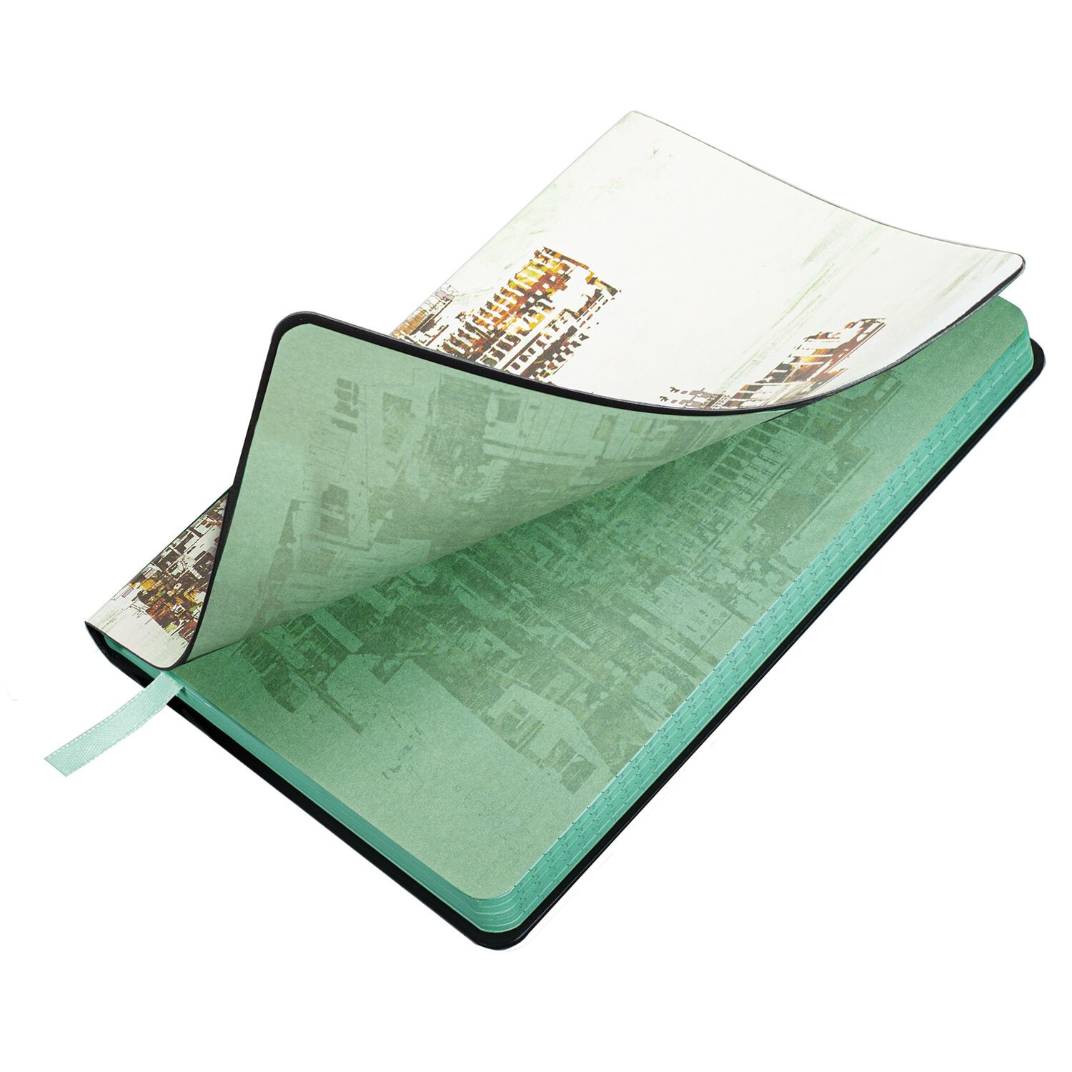 Внутренний блок включает 80 листов белой бумаги плотностью 70 г/м2. Благодаря стандартному формату А5 блокнот удобно использовать как в офисе, так и на выездных деловых встречах. Интегральная (мягкая) обложка с полноцветной печатью делает блокнот неповторимым и запоминающимся. Срез блокнота прокрашен, что придает ему особый шарм. Дополнением является закладка-ляссе, с помощью которой можно быстро открыть блокнот на нужной странице.