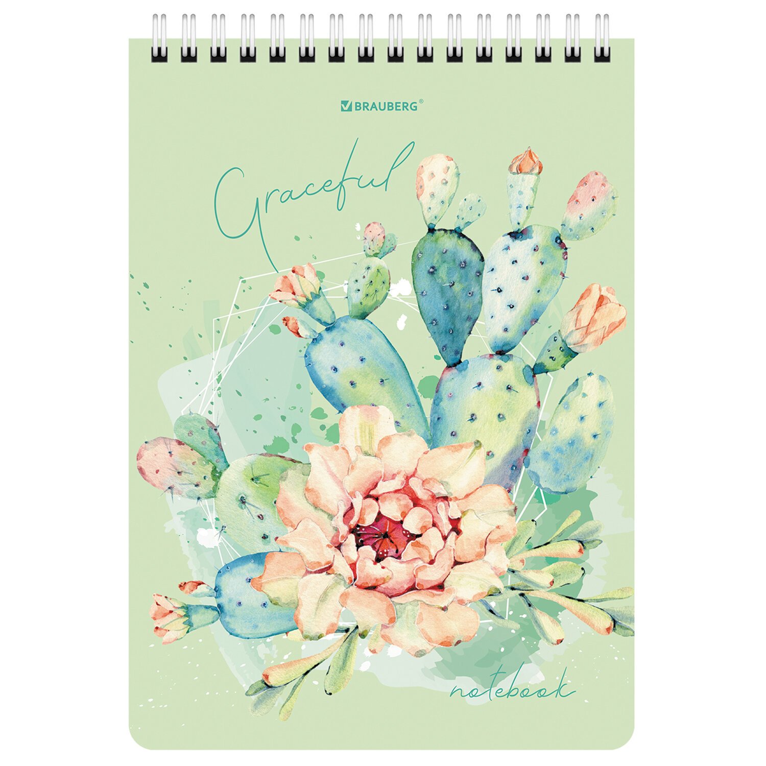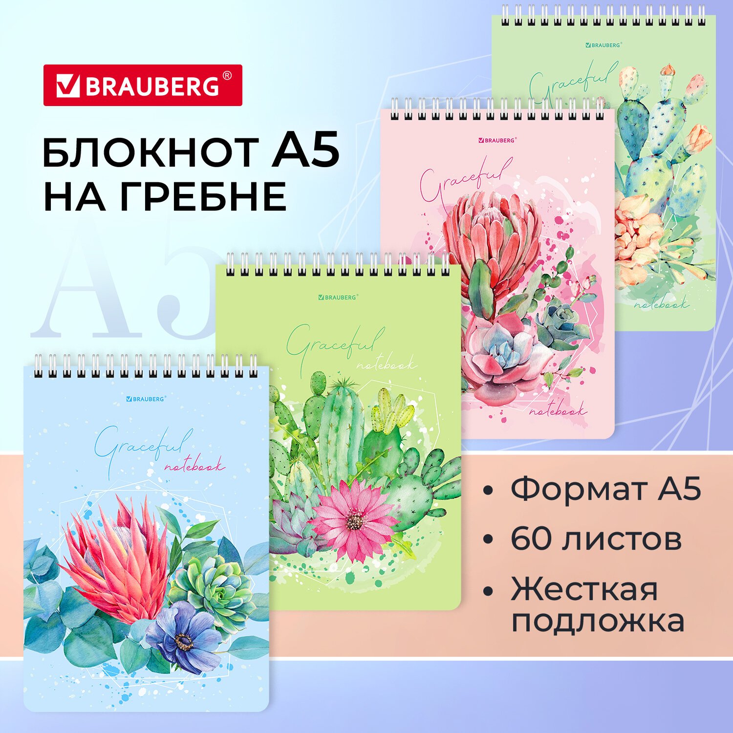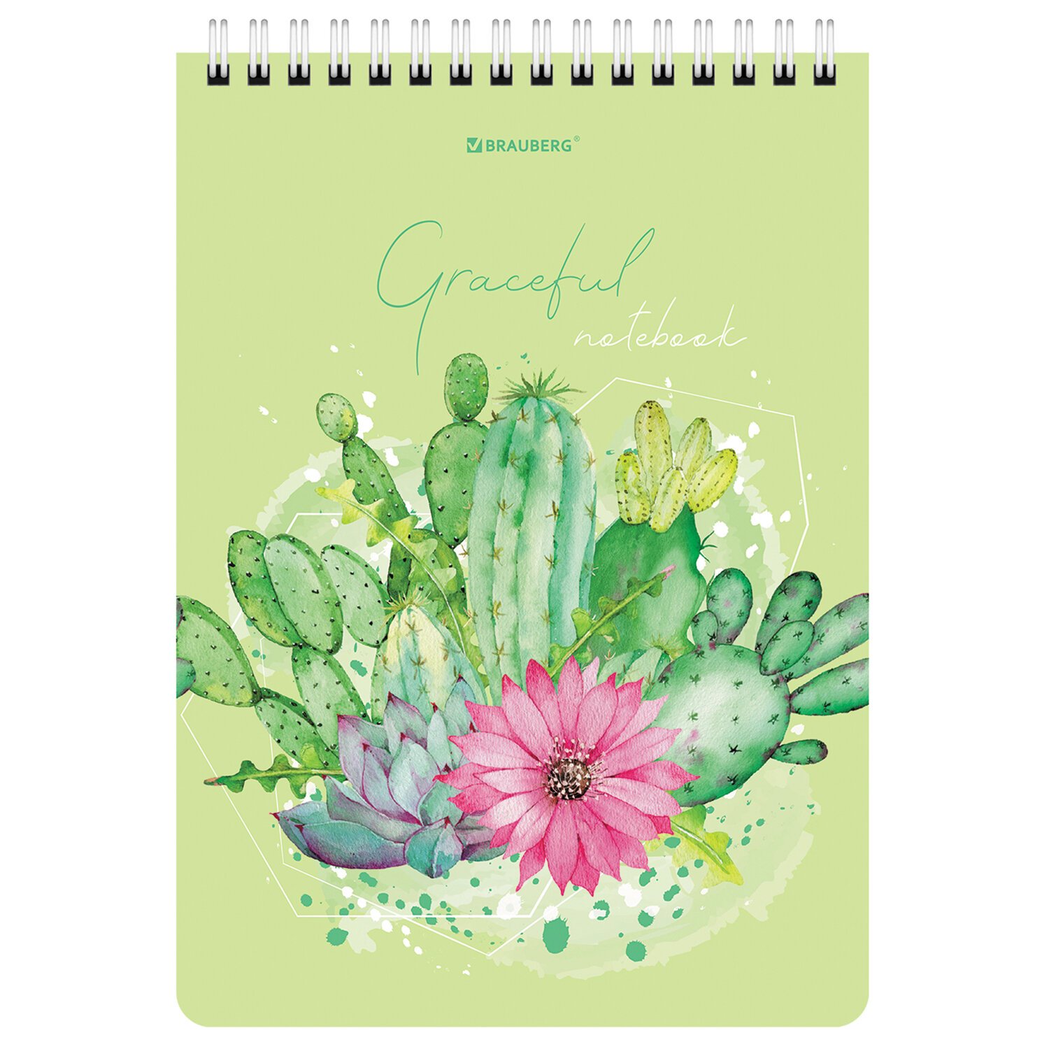 Блокнот А5 (146х206 мм), 60 л., гребень, картон, жесткая подложка, клетка, BRAUBERG, "Суккуленты", 114368