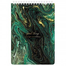 Блокнот формата А5 на евроспирали содержит 80 листов с линовкой в клетку, что позволяет зафиксировать большой объем нужной информации и дает возможность аккуратно заполнить цифровые значения, а также нанести чертежные зарисовки. Гребень расположен сверху. Обложка выполнена из мелованного картона плотностью 190 г/м2. Внутренний блок состоит из белой офсетной бумаги плотностью 60 г/м2.