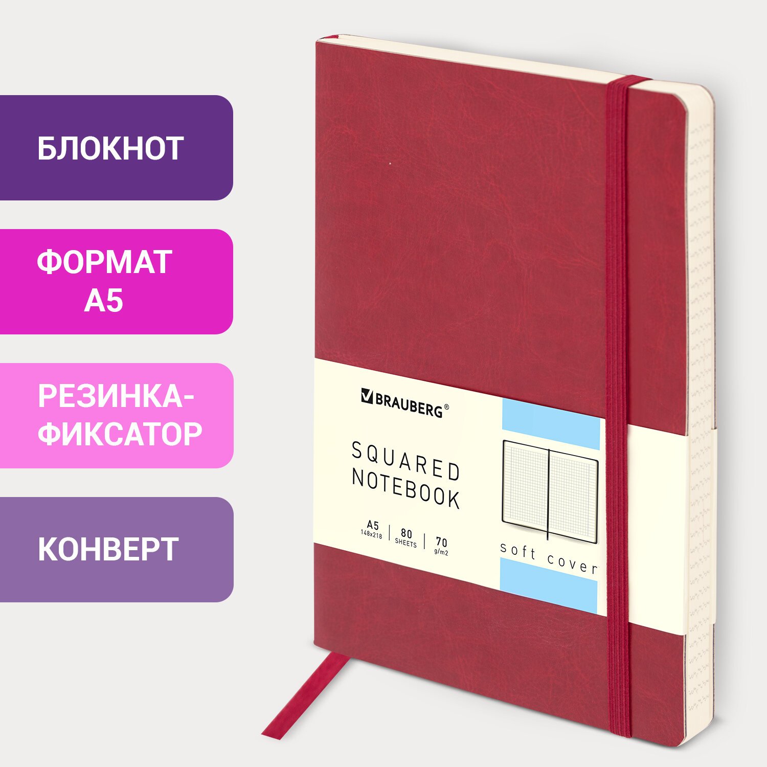 Мягкая интегральная обложка стилизована под кожу. Имеет закругленные уголки. Подходит для горячего тиснения. 80 листов позволят зафиксировать большой объем информации. Линовка блока в клетку (5х5 мм) дает возможность аккуратно заполнить цифровые значения, а также нанести чертежные зарисовки. Внутренний блок выполнен из офсета тонированного цвета плотностью 70 г/м2 и крепится к обложке с помощью книжного переплета. На внутренней стороне задней обложки есть декоративный конверт для разных мелочей в виде визиток, напоминалок и т. д. Снабжен резинкой-фиксатором, благодаря чему блокнот не откроется в сумочке или портфеле и листы не помнутся. Дополнением является закладка-ляссе, с помощью которой при необходимости можно быстро открыть нужную страницу. Формат блокнота А5 (148х218 мм) позволит владельцу поместить его в кейс или сумку малых габаритов.