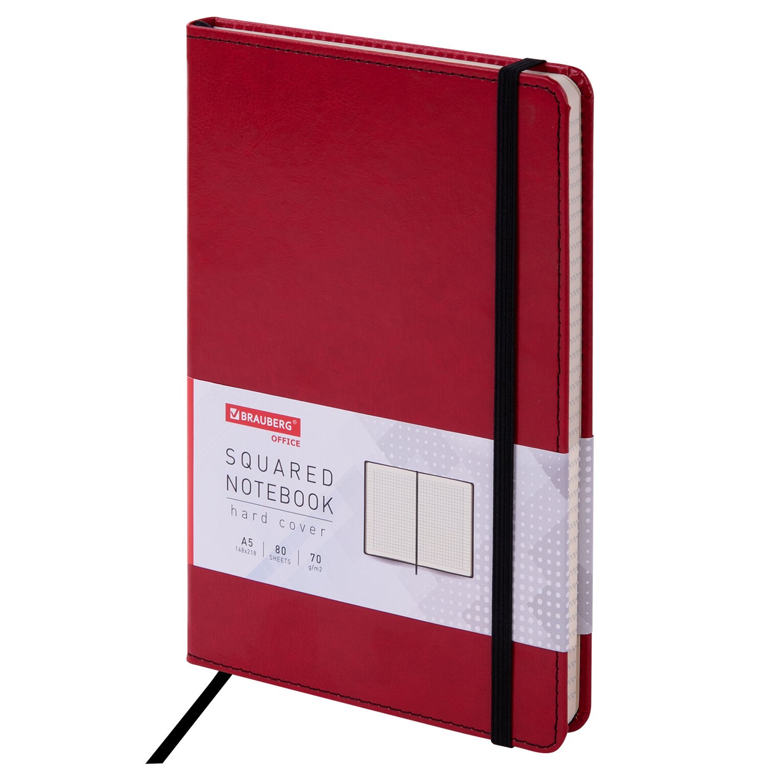 Блокнот А5 (148x218 мм), BRAUBERG "Office", под кожу, 80 л., резинка, клетка, красный, 111030