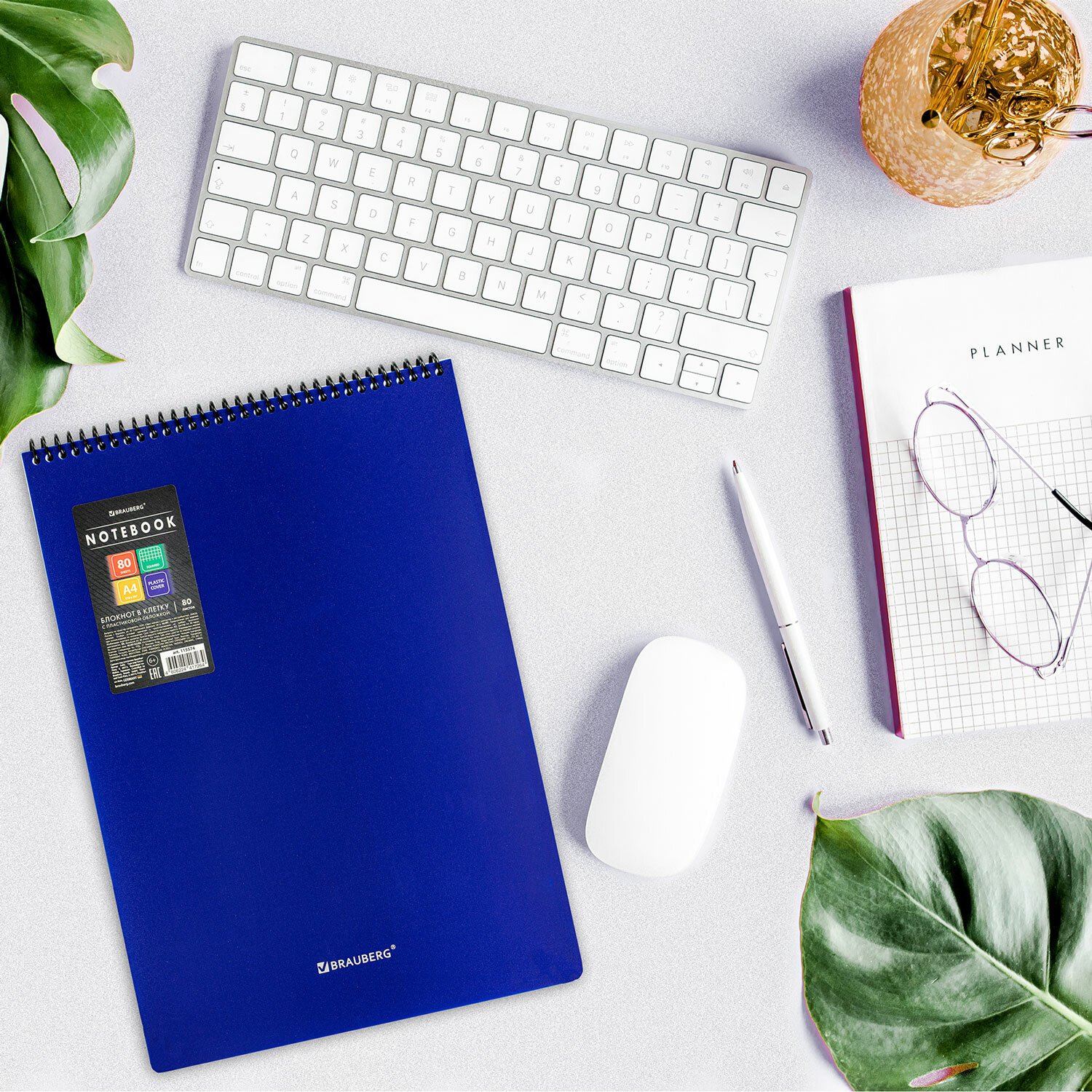Блокнот БОЛЬШОГО ФОРМАТА А4, 80 л., обложка пластик, клетка, BRAUBERG "Metropolis", СИНИЙ, 115574
