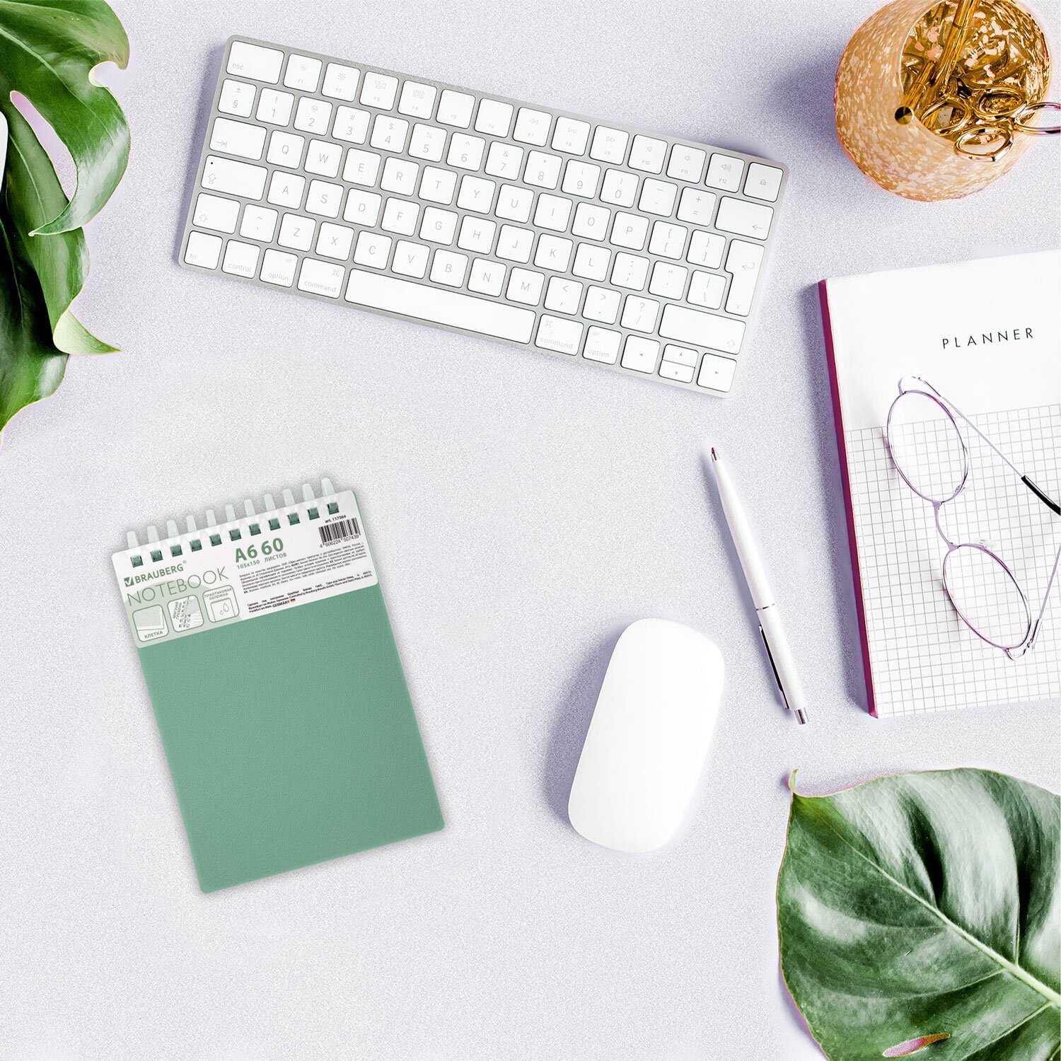 Блокнот МАЛЫЙ ФОРМАТ А6 60л, BRAUBERG, силиконовый гребень, обложка пластик, клетка, зеленый, 117564