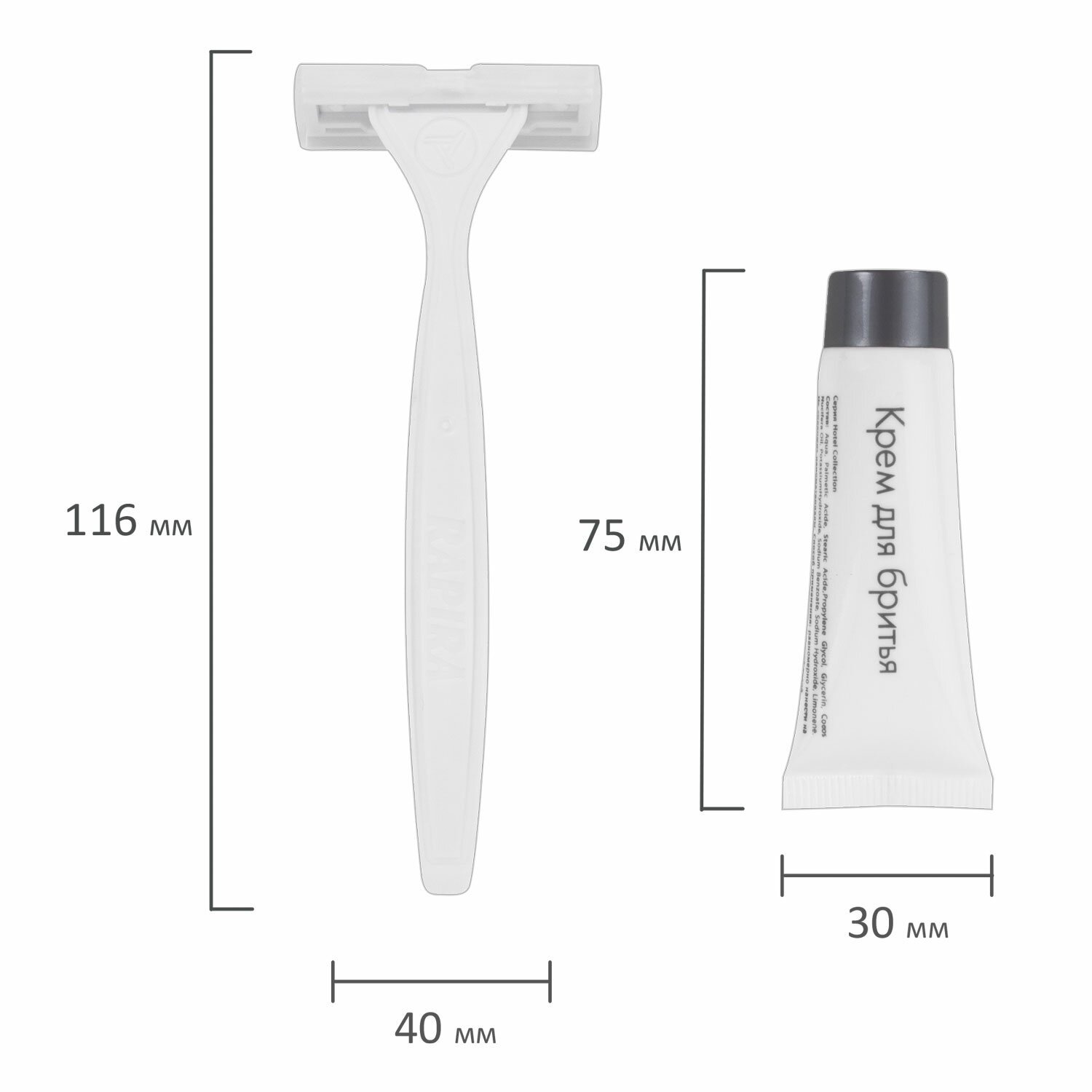 В наборе: одноразовый бритвенный станок с двойным лезвием из высококачественной стали со смазывающей пластиной с алоэ вера, крем для бритья в тубе 8 г.