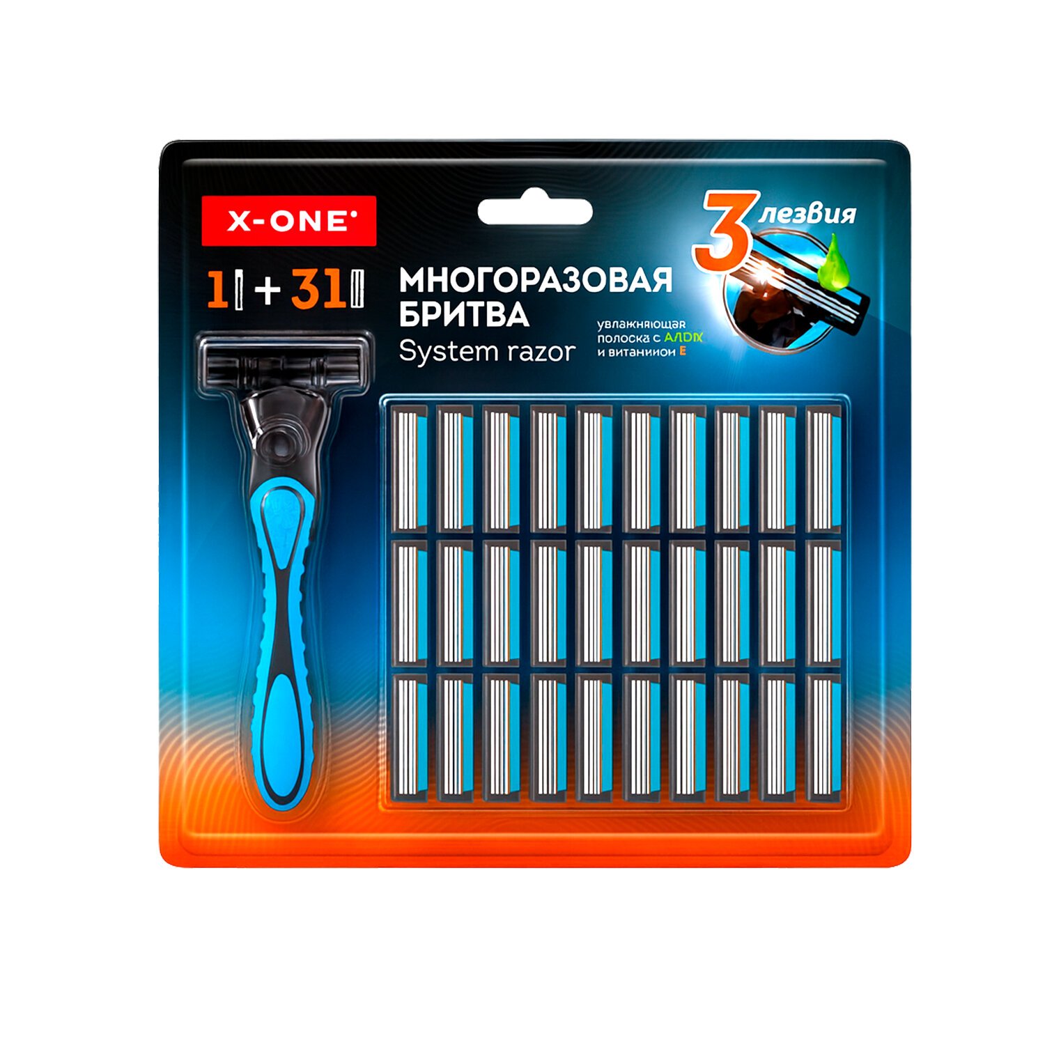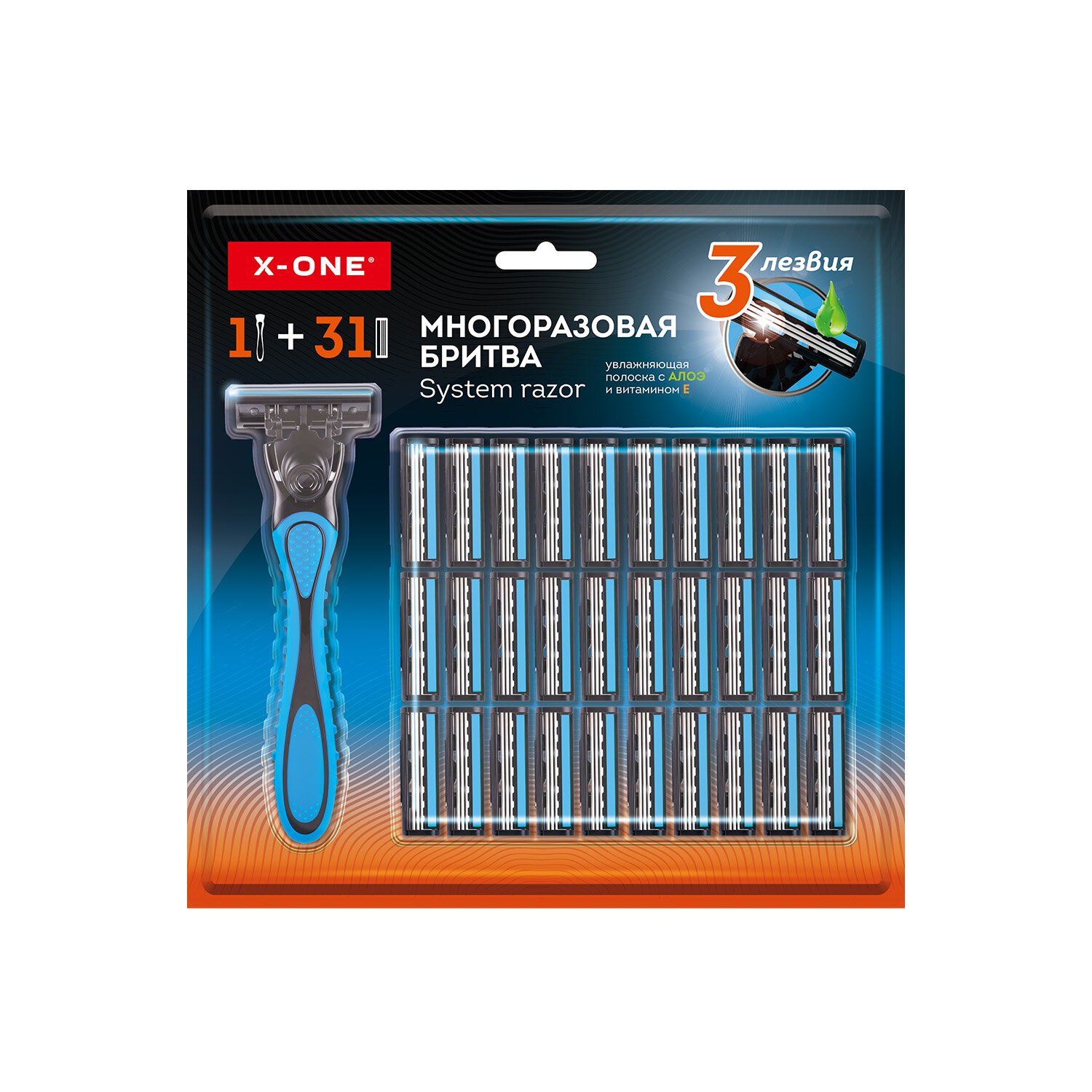Бритвенный станок многоразовый мужской, 3 лезвия, 31 кассета, синий, X-ONE, 700024