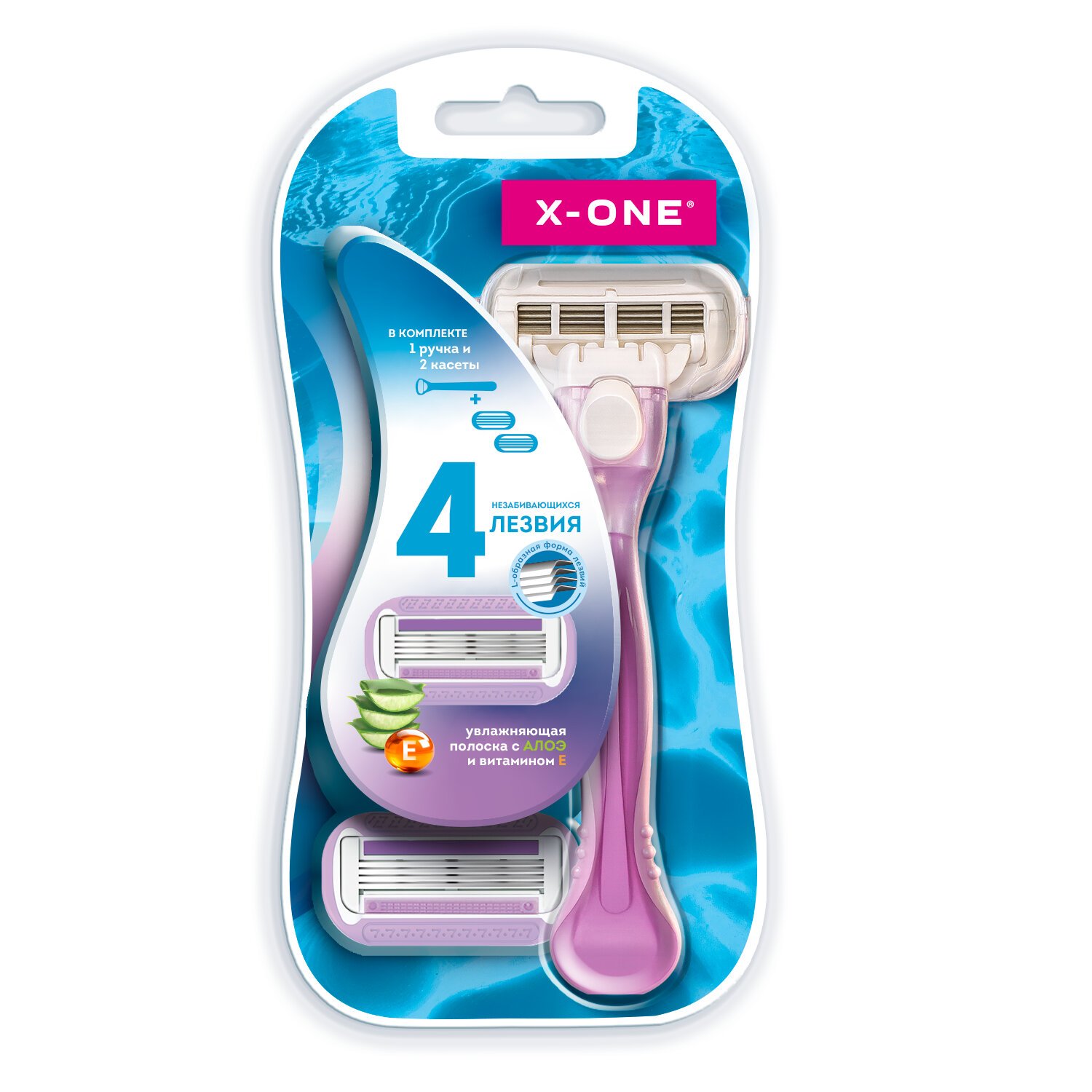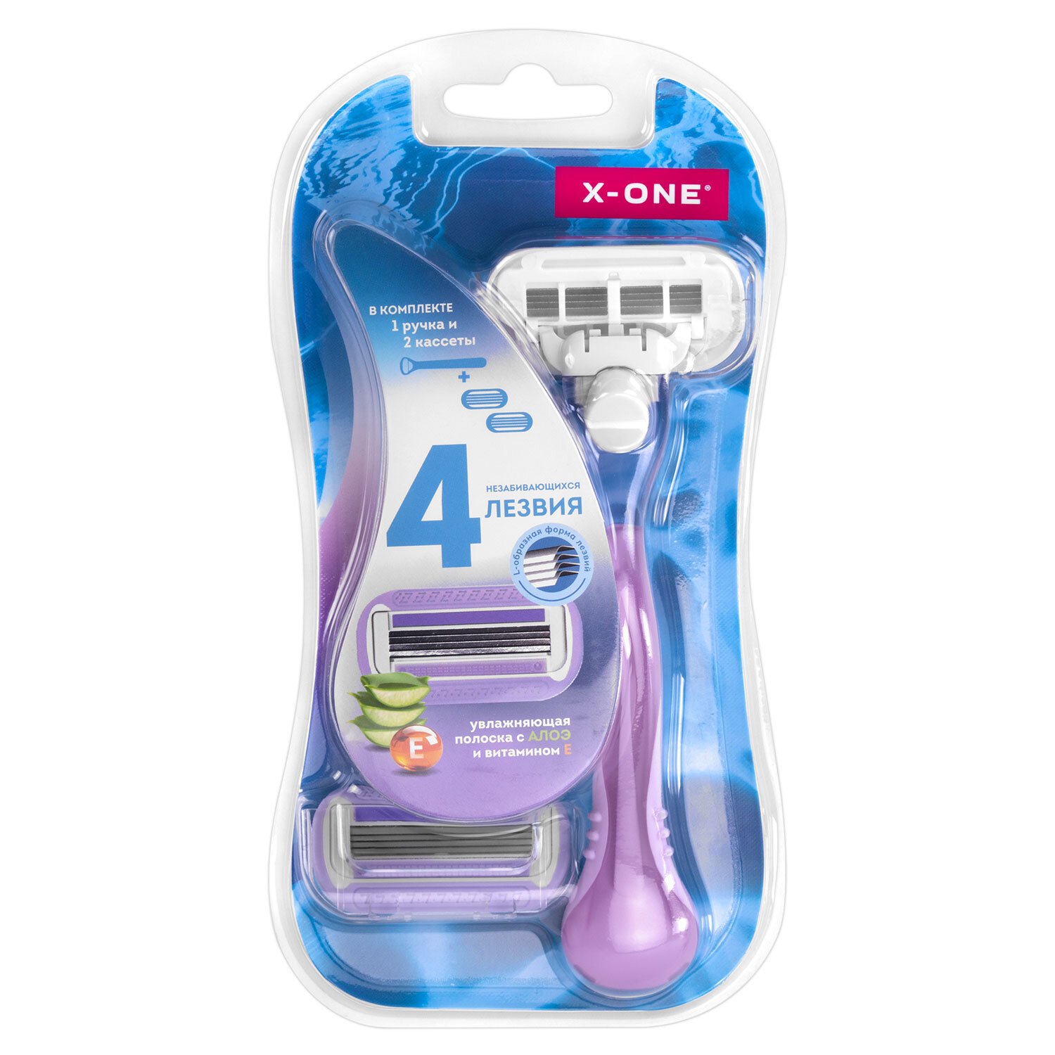 Бритвенный станок многоразовый женский, 4 лезвия, 2 кассеты, X-ONE, 700018