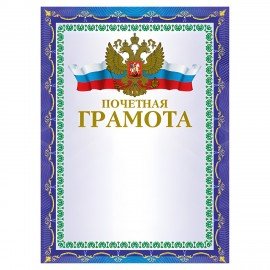 Грамота "Почетная" А4, мелованный картон, конгрев, тиснение фольгой, синяя, BRAUBERG, 123057