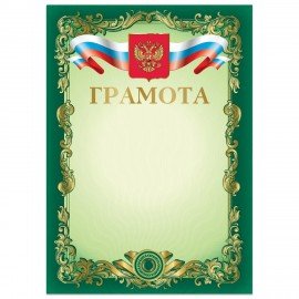 Грамота А4, мелованный картон, конгрев, тиснение фольгой, зеленая, BRAUBERG, 123061