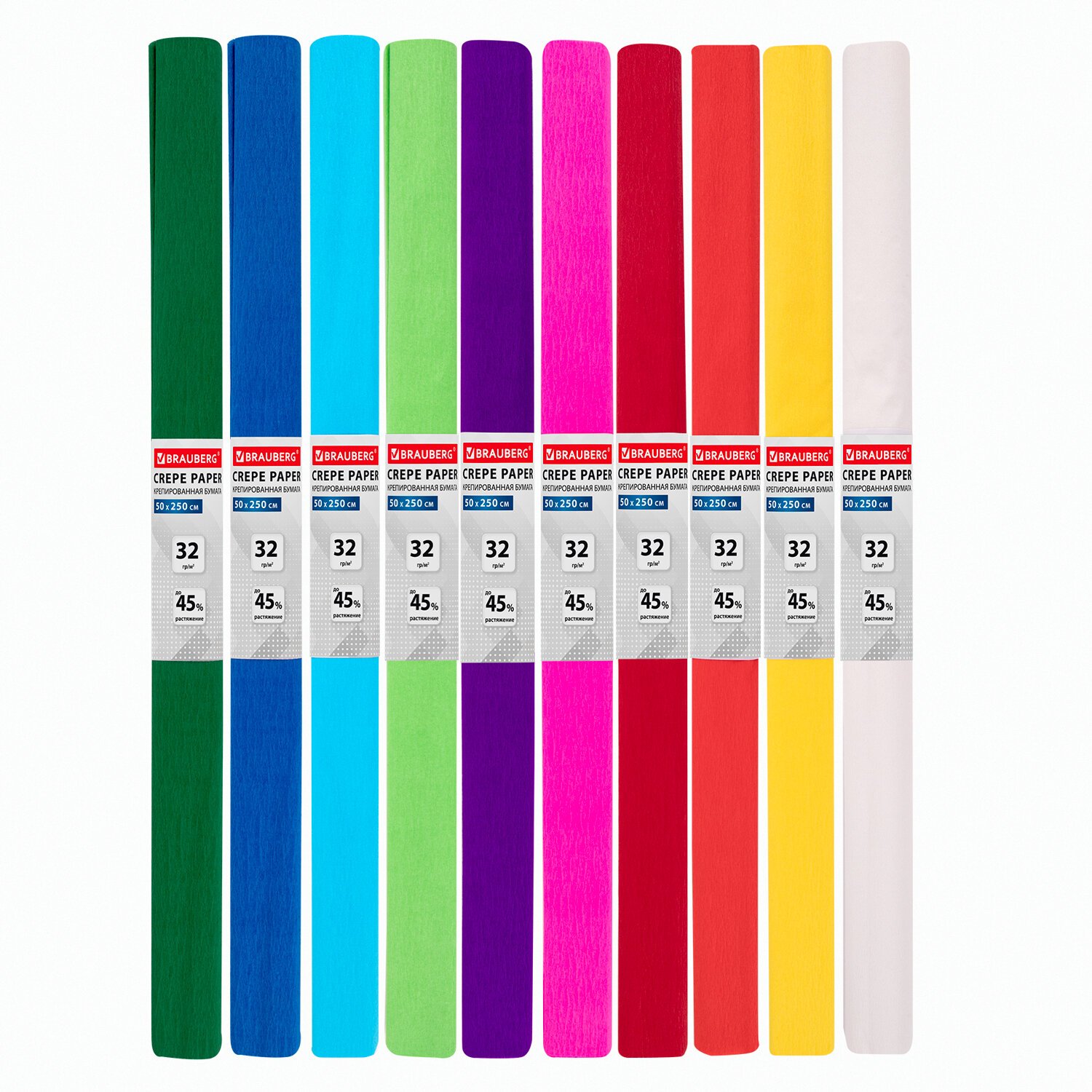 Бумага гофрированная/креповая, 32 г/м2, 50х250 см, 10 рулонов, яркие цвета, BRAUBERG, 112556