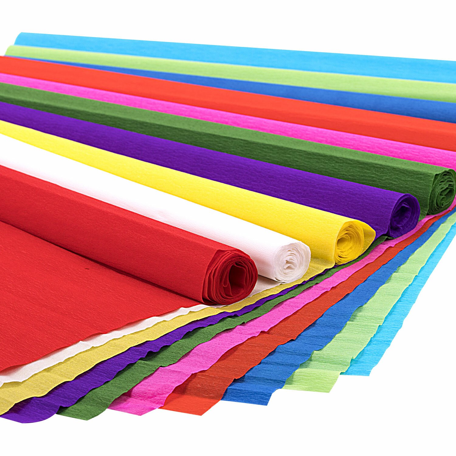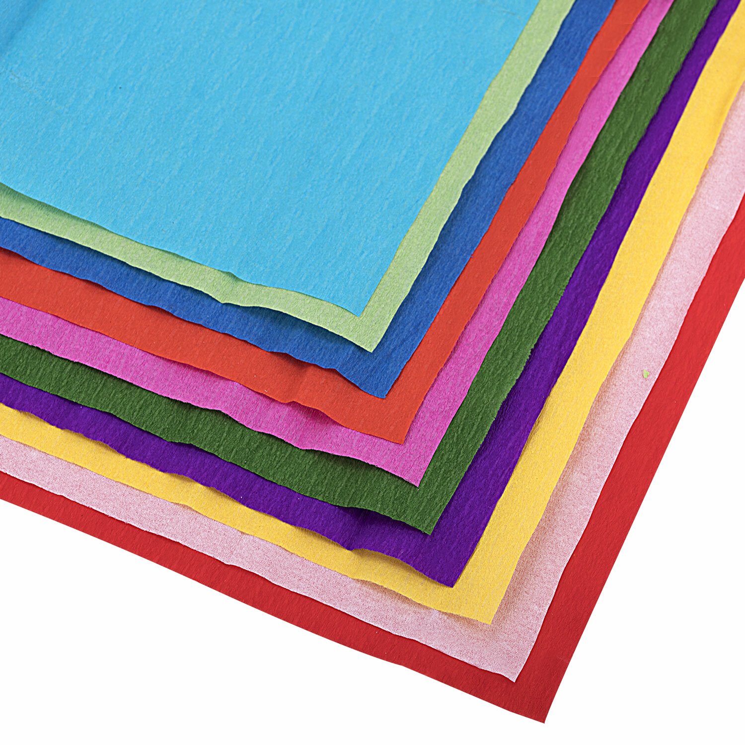Гофрированная (креповая) бумага представляет собой бумажную продукцию с неровной, складчатой поверхностью. Размер бумаги - 50х250 см, плотность – 32 г/м2, удлинение при натяжении – 45%. Цвет - Ассорти ярких цветов. В наборе: белый, желтый, оранжевый, красный, розовый, фиолетовый, голубой, синий, светло-зеленый, травяной.
