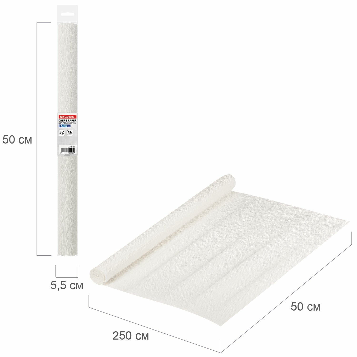 Бумага гофрированная/креповая, 32 г/м2, 50х250 см, белая, в рулоне, BRAUBERG, 126528