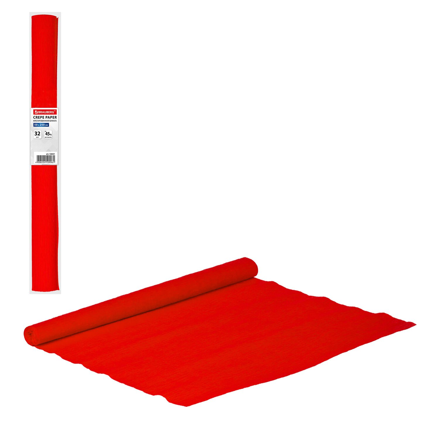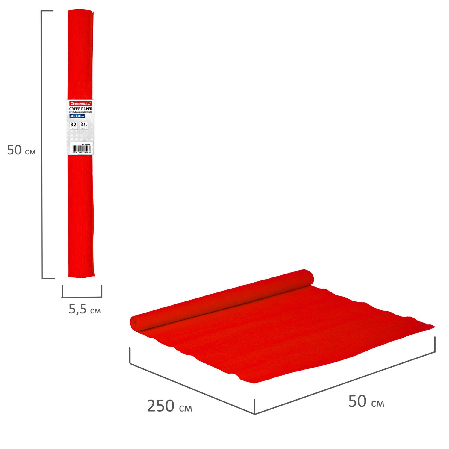 Бумага гофрированная/креповая, 32 г/м2, 50х250 см, красная, в рулоне, BRAUBERG, 126531