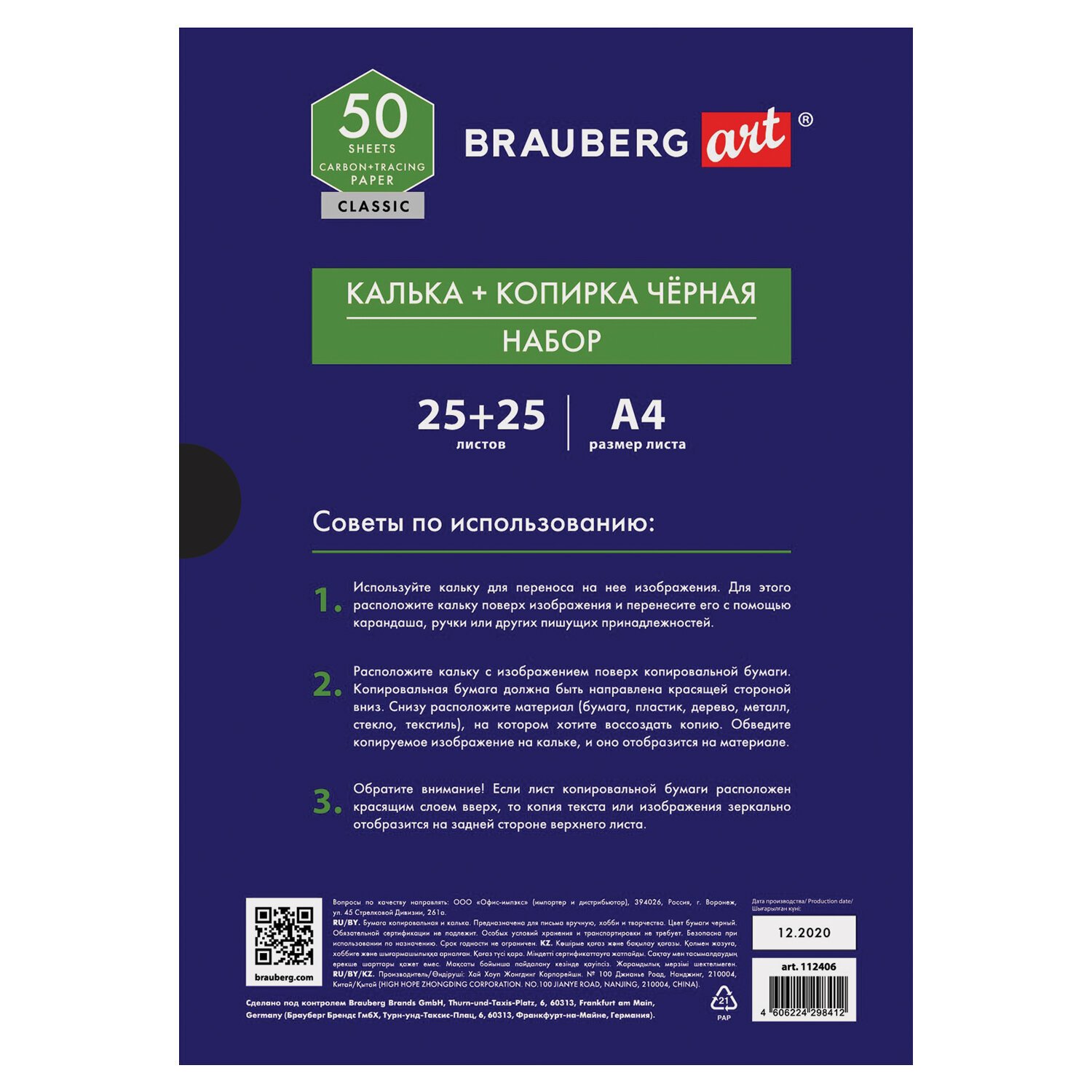 Бумага копировальная (копирка) черная (25 листов) + калька (25 листов), BRAUBERG ART "CLASSIC", 112406