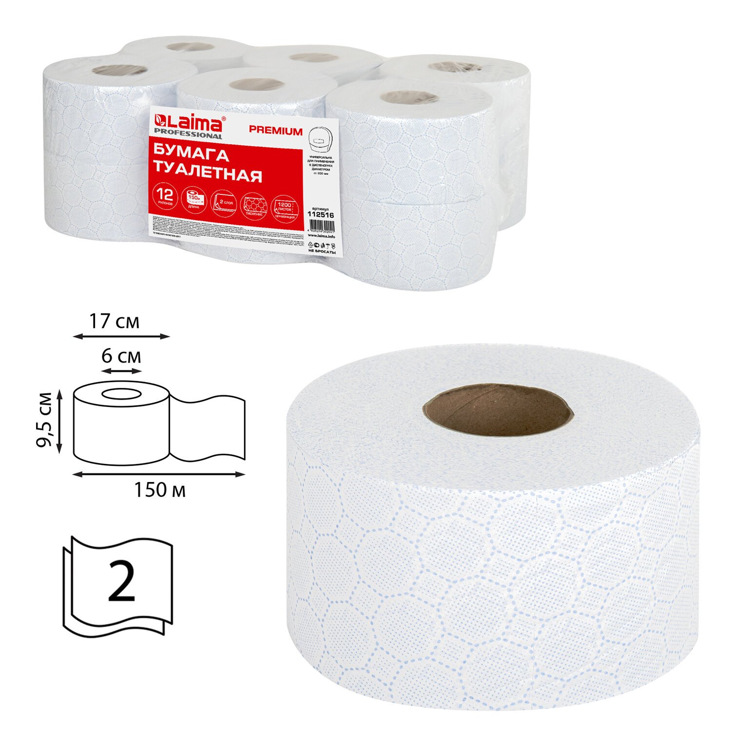 Бумага туалетная 150 м, LAIMA (Система Т2) PREMIUM, 2-слойная, белая с ЦВЕТНЫМ ТИСНЕНИЕМ, КОМПЛЕКТ 12 рулонов, 112516
