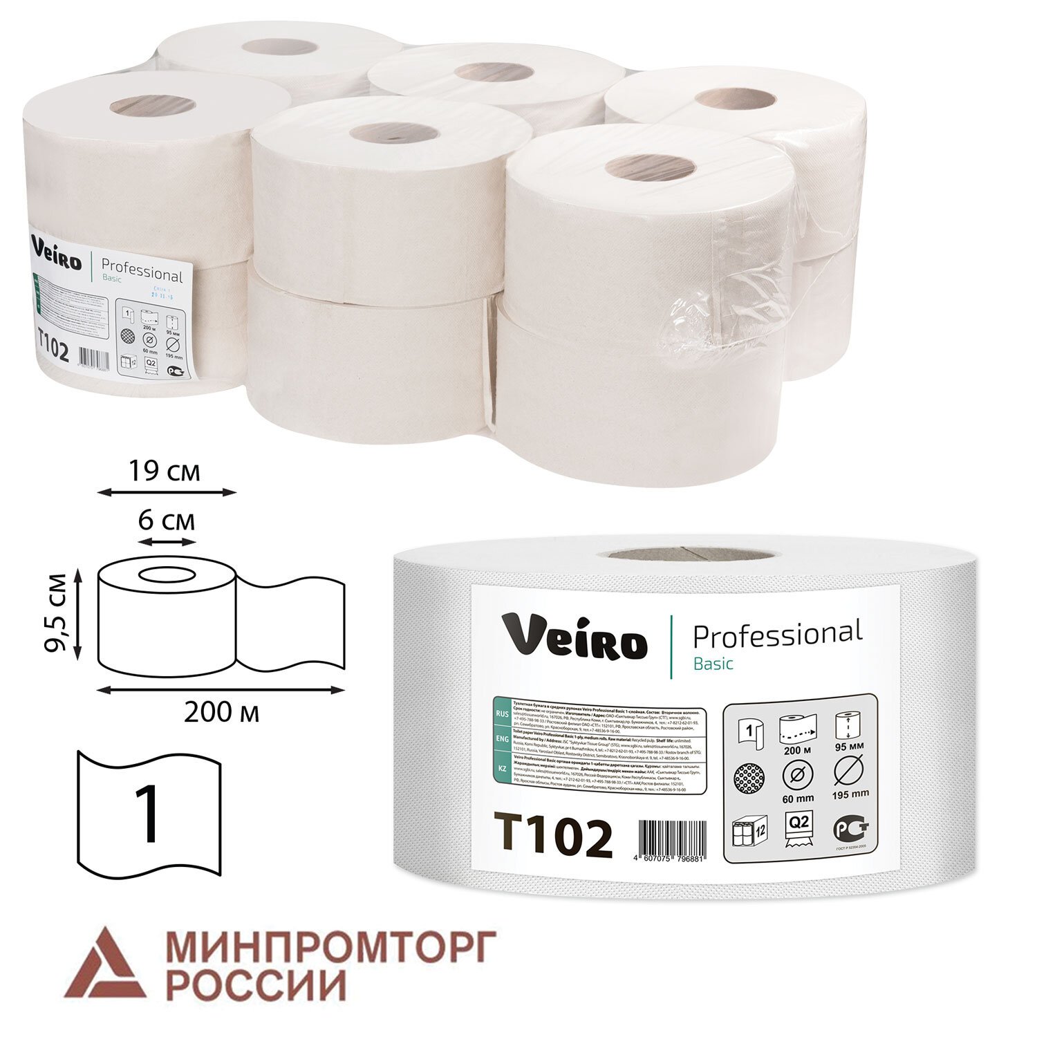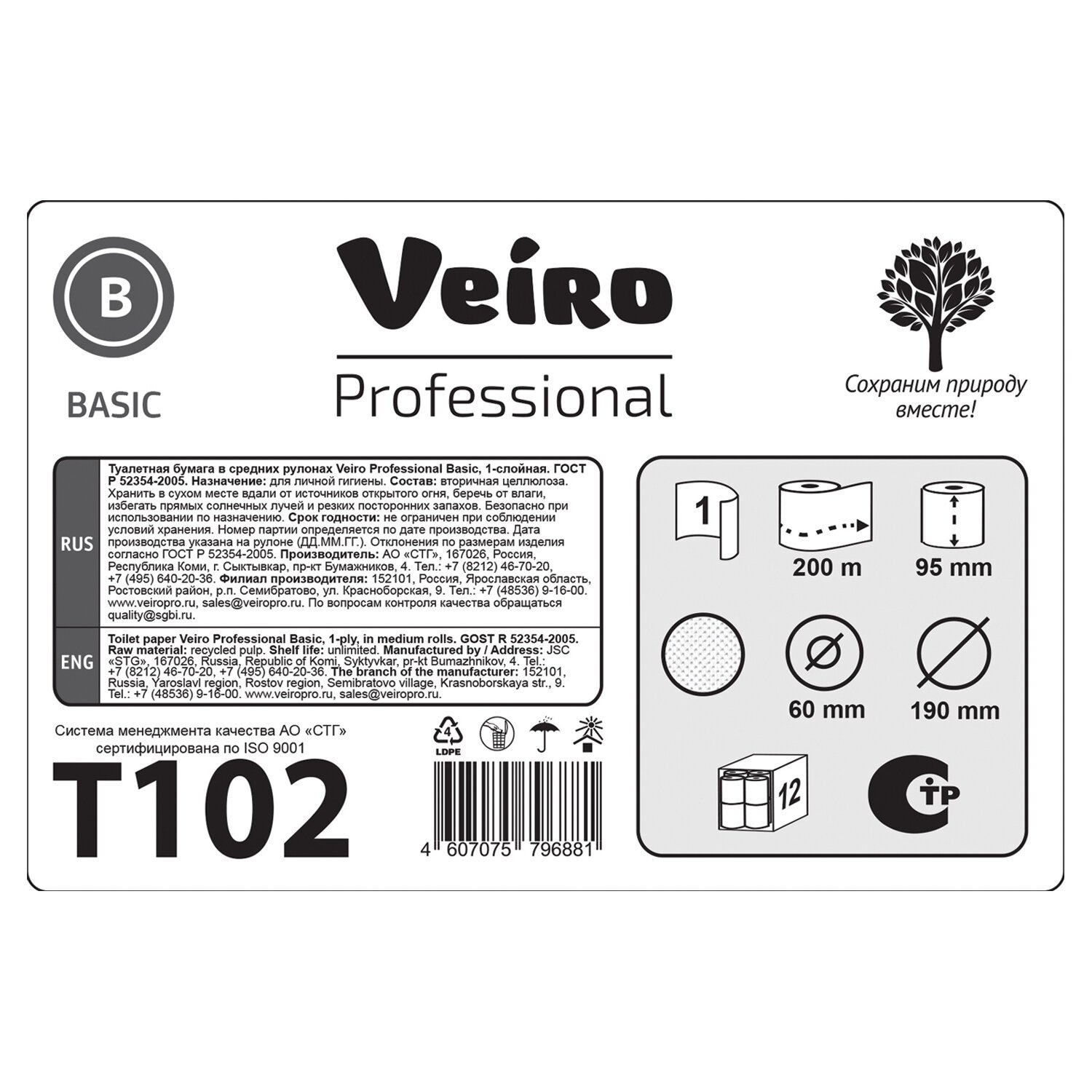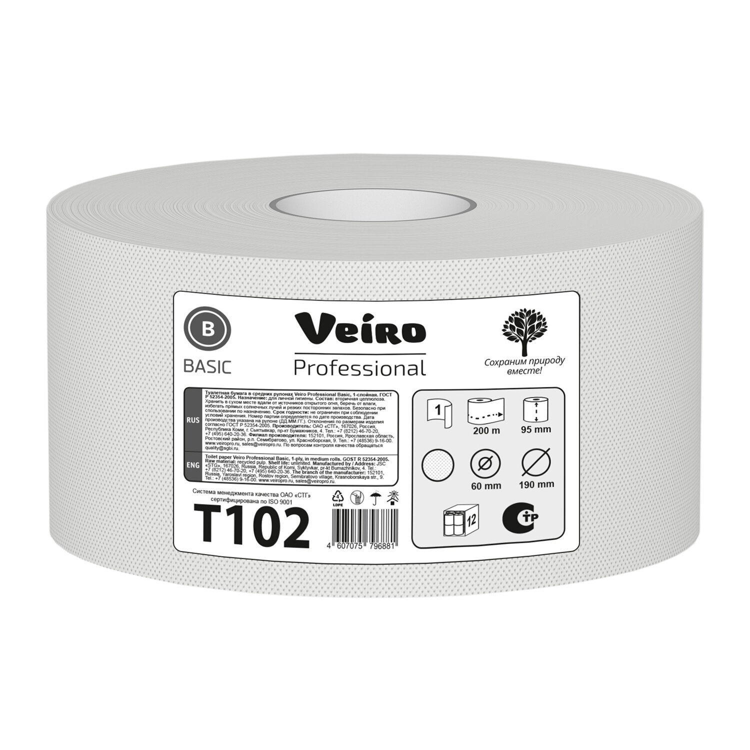 Бумага туалетная 200 м, VEIRO Professional (Система T2), КОМПЛЕКТ 12 шт., Basic, T102