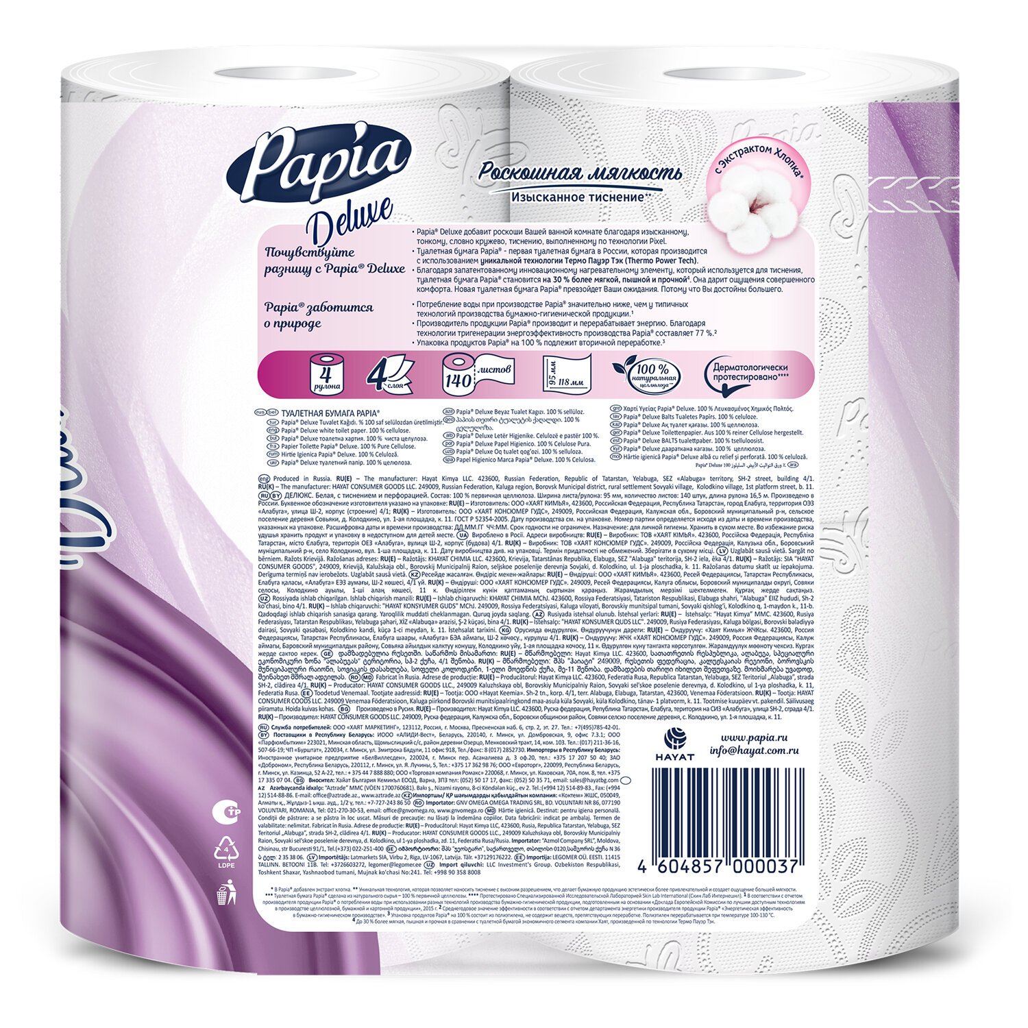Бумага туалетная быт., спайка 4 шт., 4-слойная (4х16 м), PAPIA DELUXE, белая, 5080736