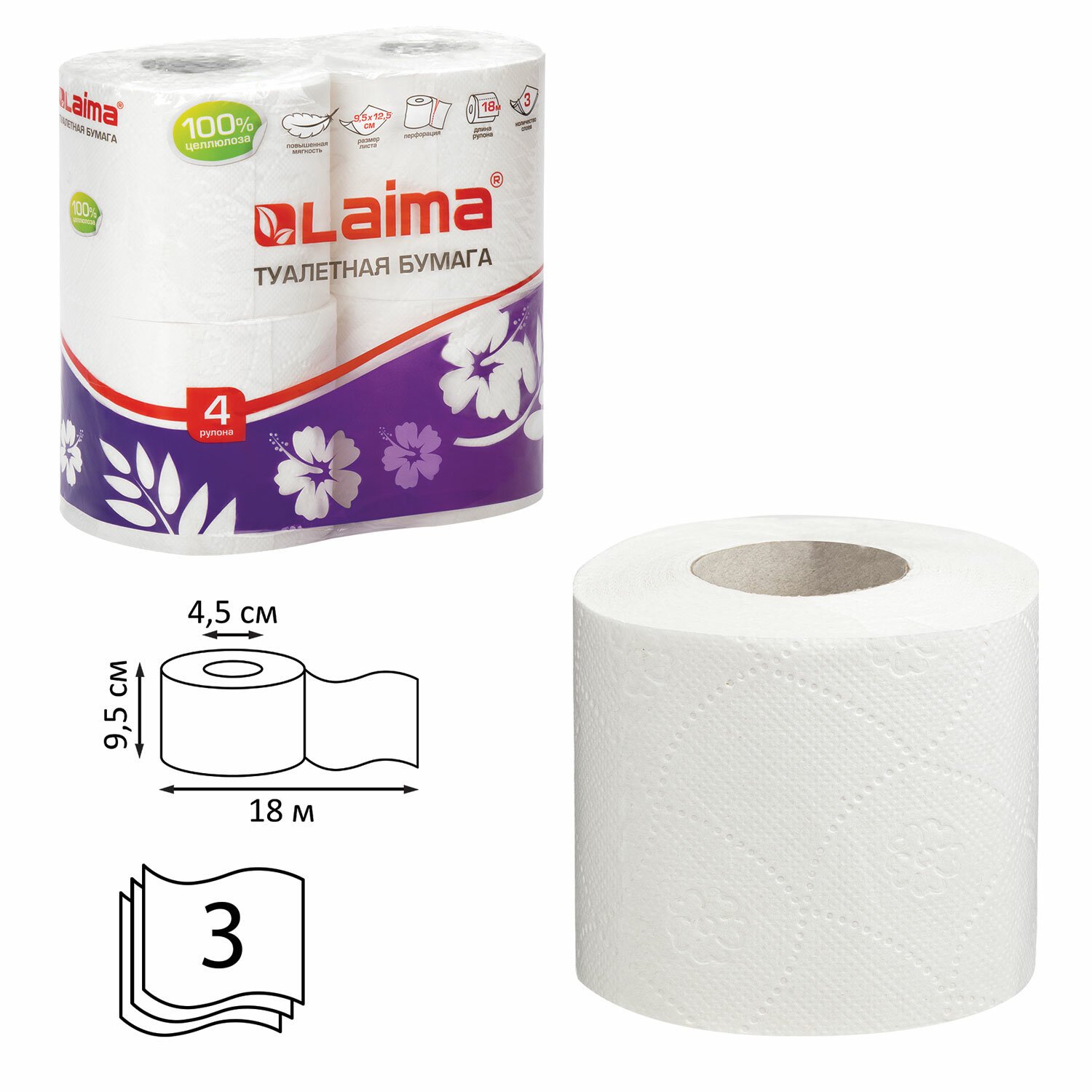 Бумага туалетная бытовая, спайка 4 шт., 3-х слойная, (4х18 м), LAIMA, белая, 128724