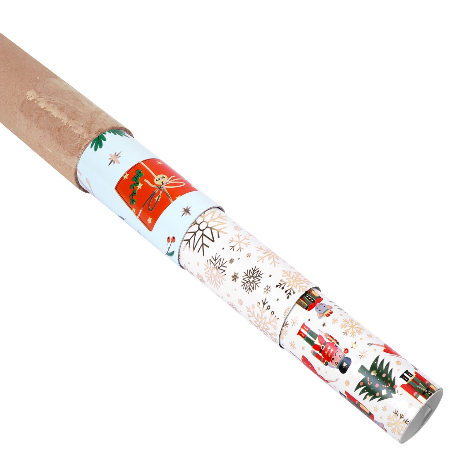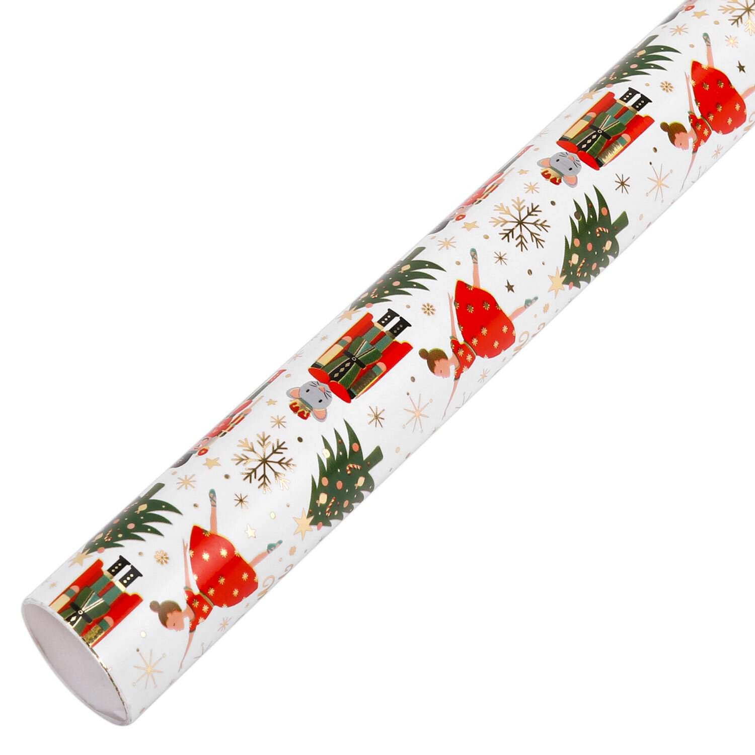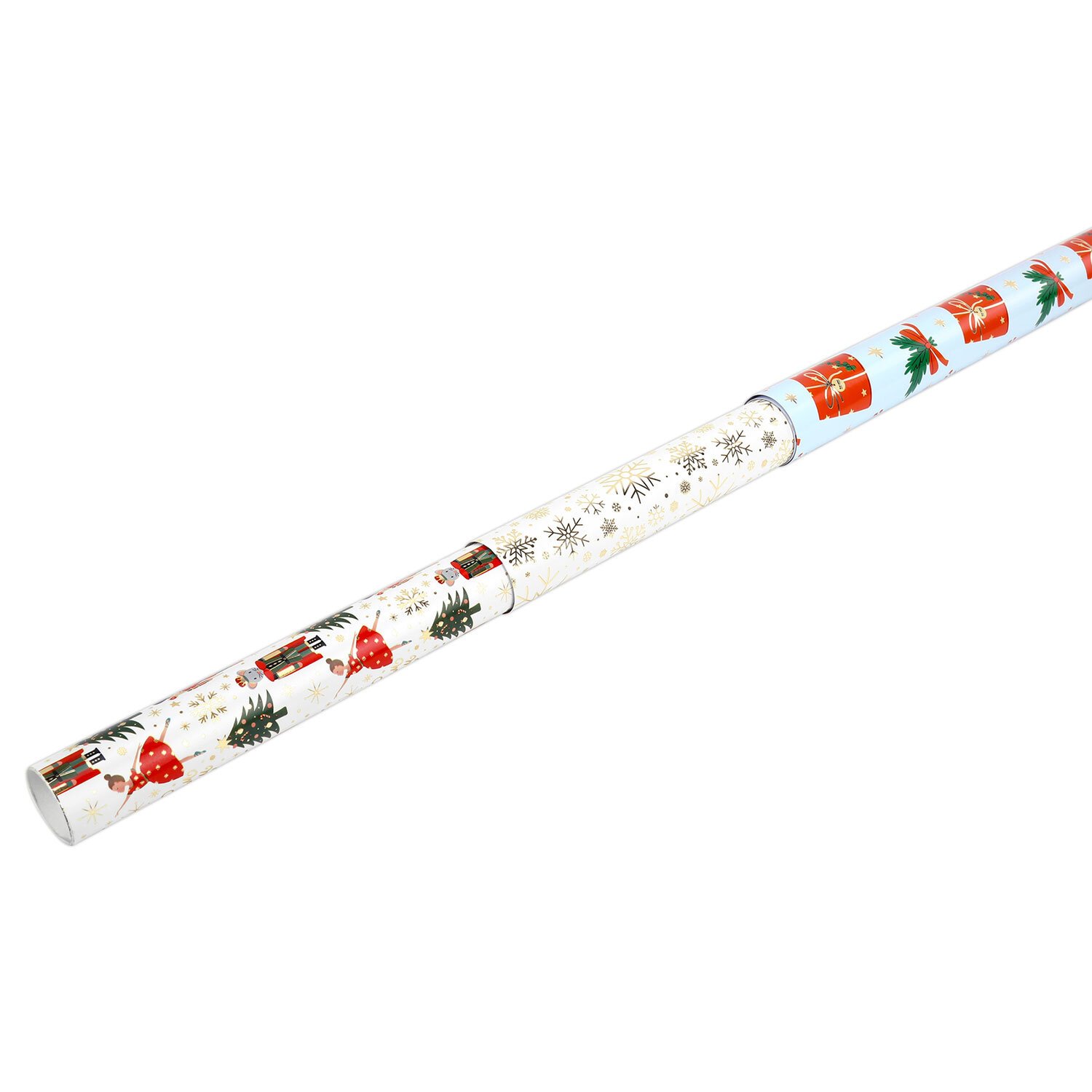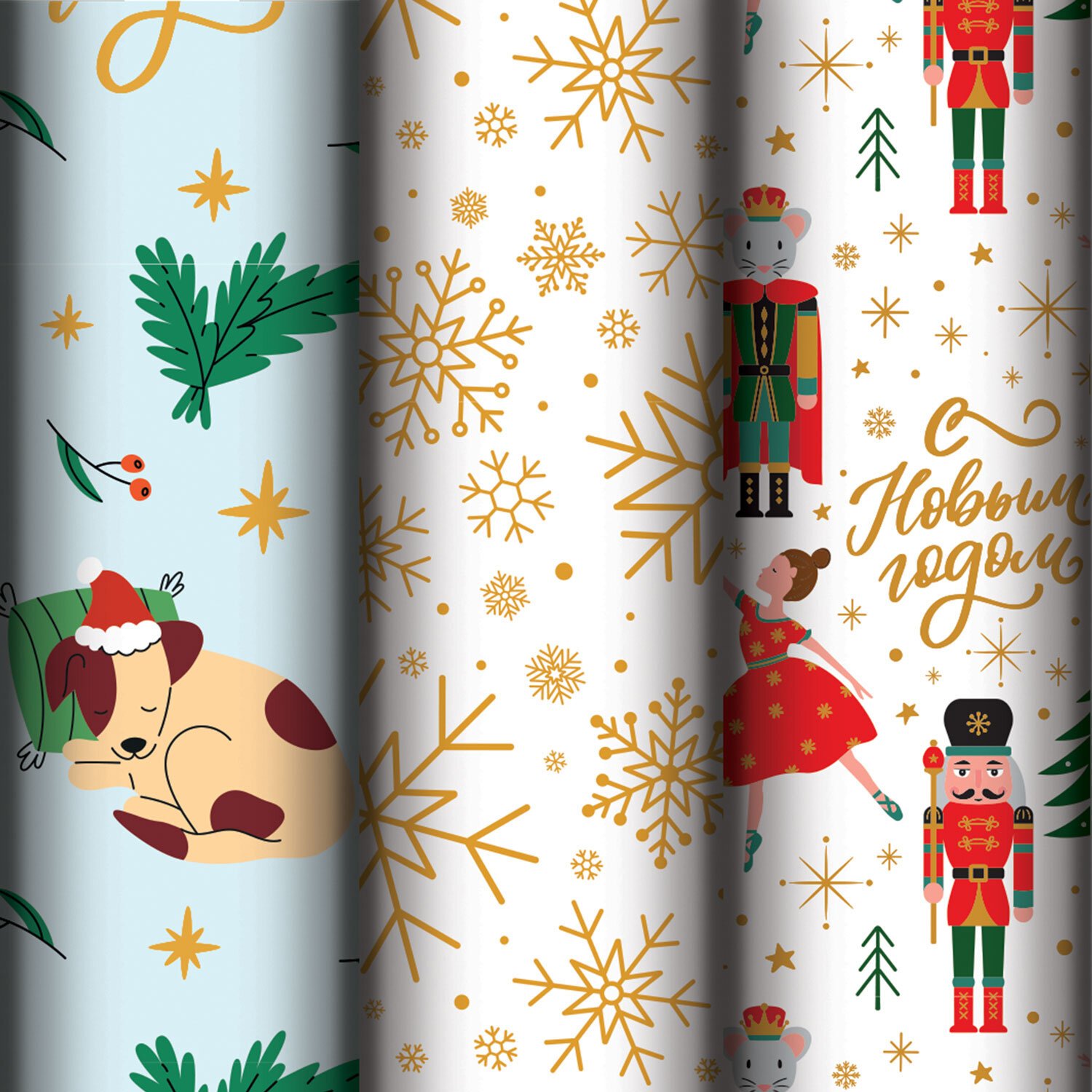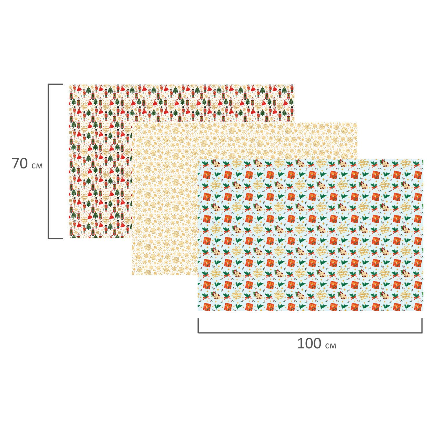 Набор из 3 рулонов, каждый рулон – размером 70х100 см. Все рулоны выполнены в красивом новогоднем дизайне с ярким эффектом. Представляют собой легкомелованную бумагу с нанесенной на нее металлизированной пленкой, за счет которой и достигается красивый переливающийся эффект. Итоговая плотность бумаги – 80 г/м2.