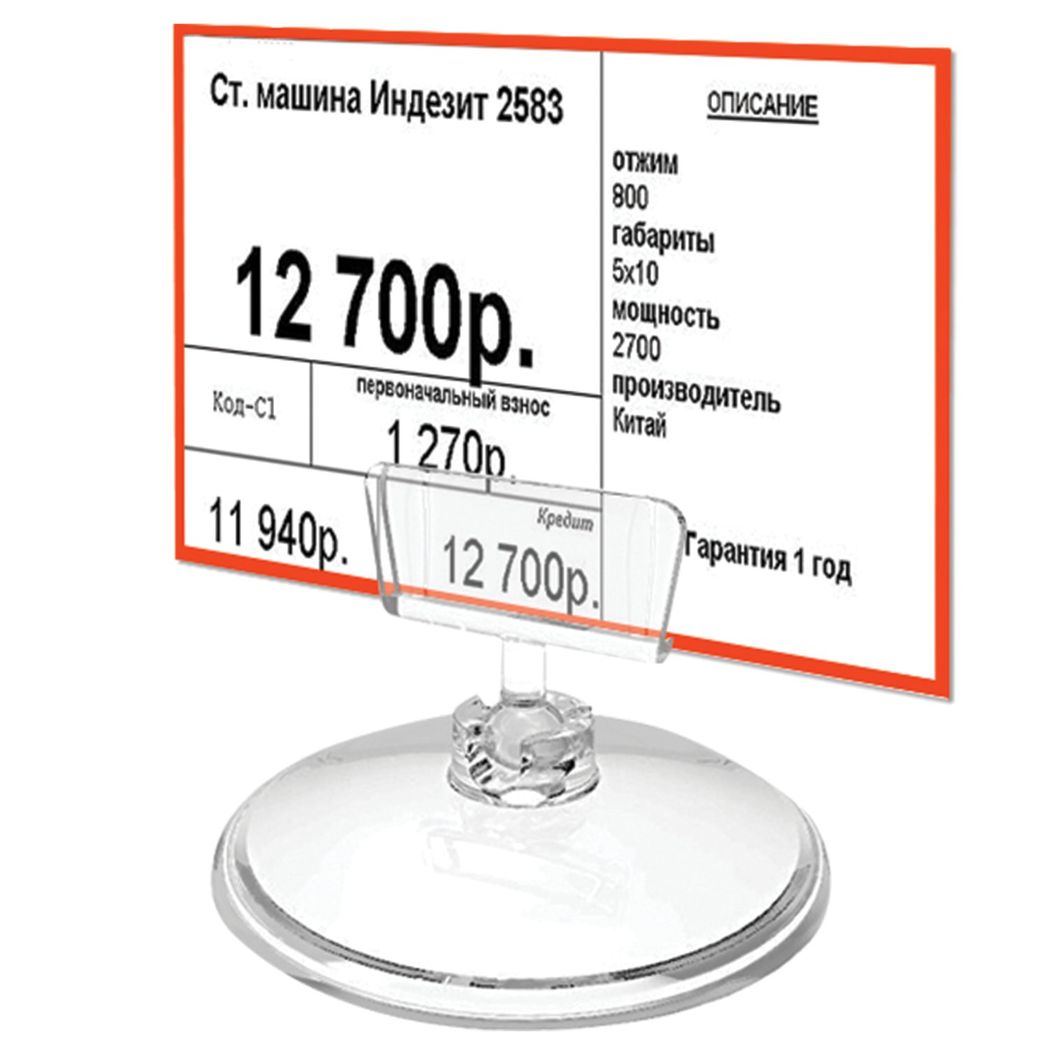 Ценникодержатель на прозрачной пластиковой подставке. Шарнирное соединение позволяет регулировать угол наклона.
