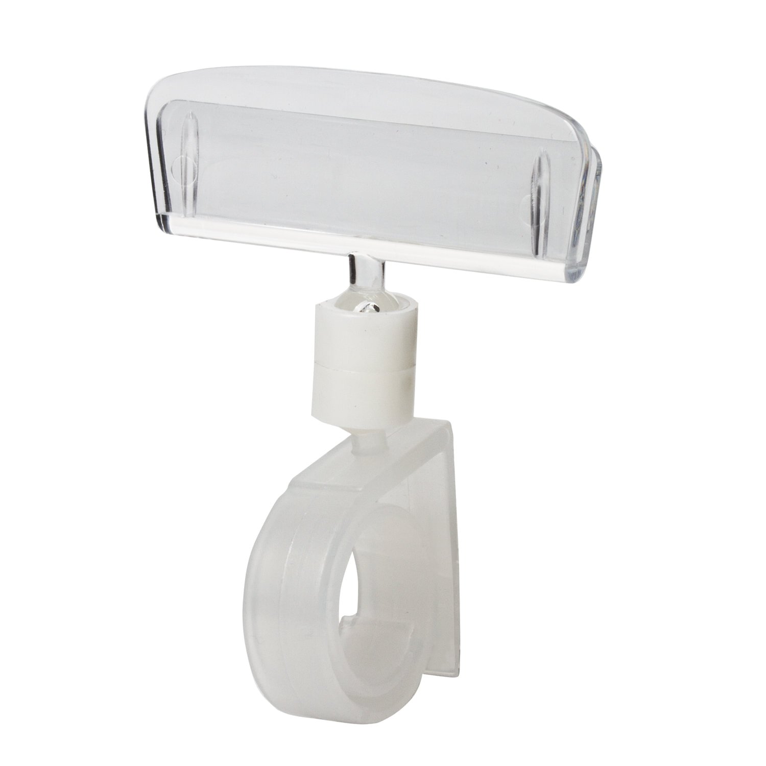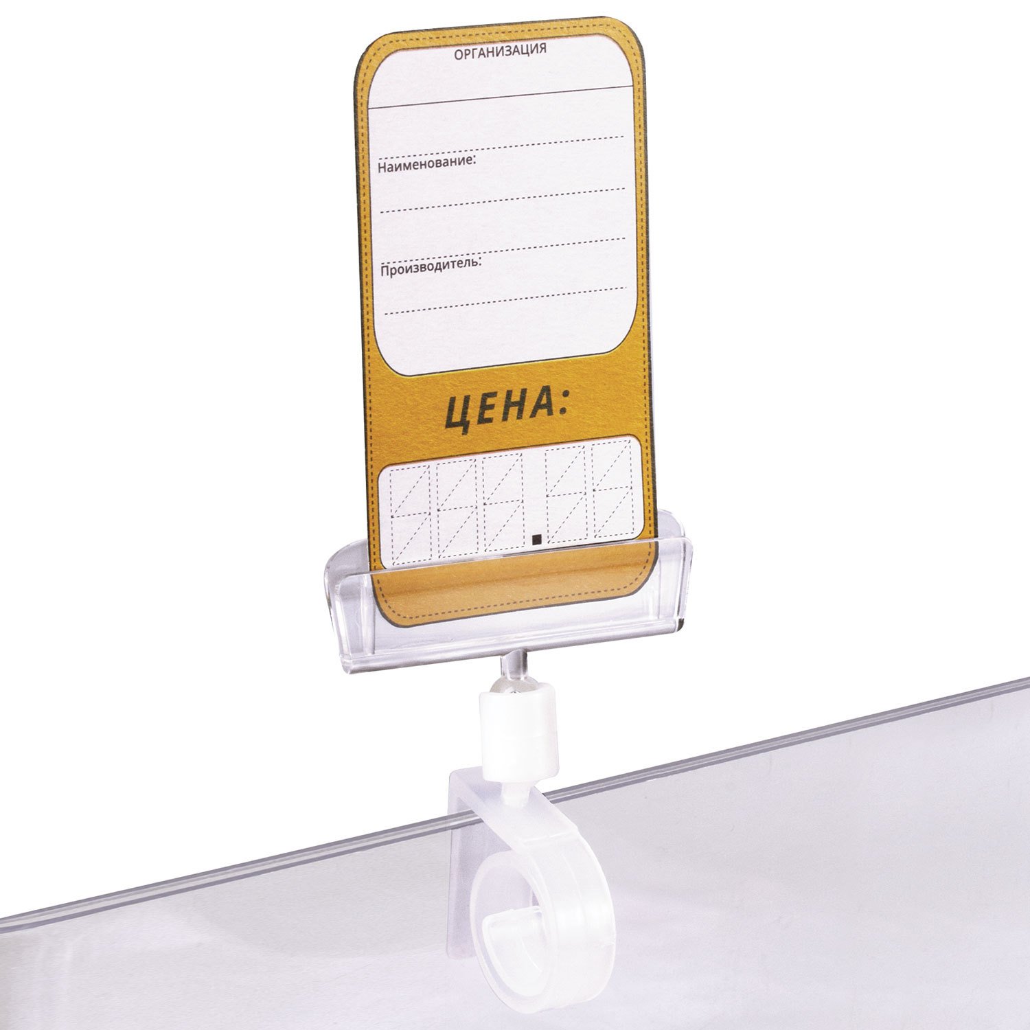 Универсальный держатель ценника "улитка", позволяющий крепить ценник на посуду, продукты, край полки разной толщины. Угол наклона ценника регулируется с помощью шарниров.