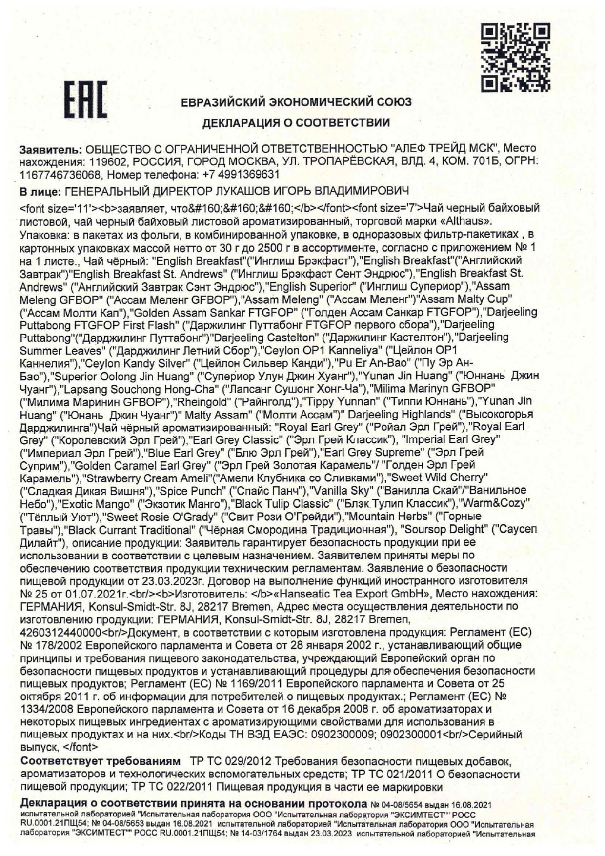 Чай ALTHAUS "English Breakfast" черный, 15 пирамидок по 2,75 г, ГЕРМАНИЯ, TALTHL-P00001