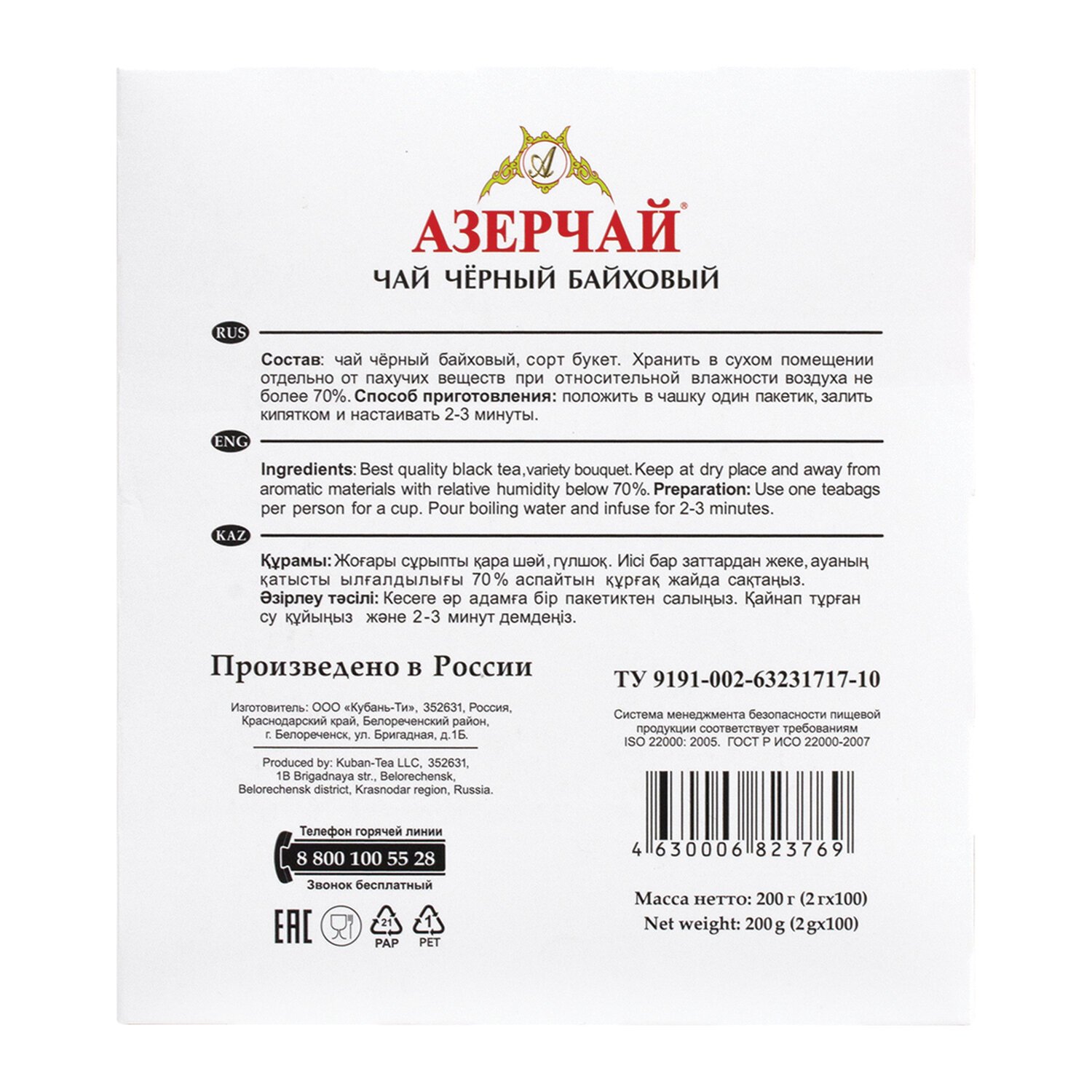 Чай АЗЕРЧАЙ "Букет" черный, 100 пакетиков по 2 г, 419831