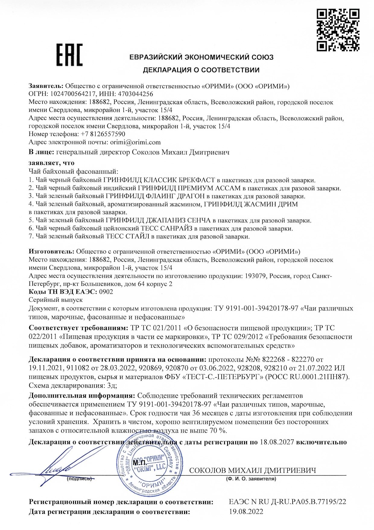 Чай GREENFIELD "Jasmine Dream" зеленый с жасмином, 100 пакетиков в конвертах по 2 г, 0586-09